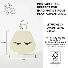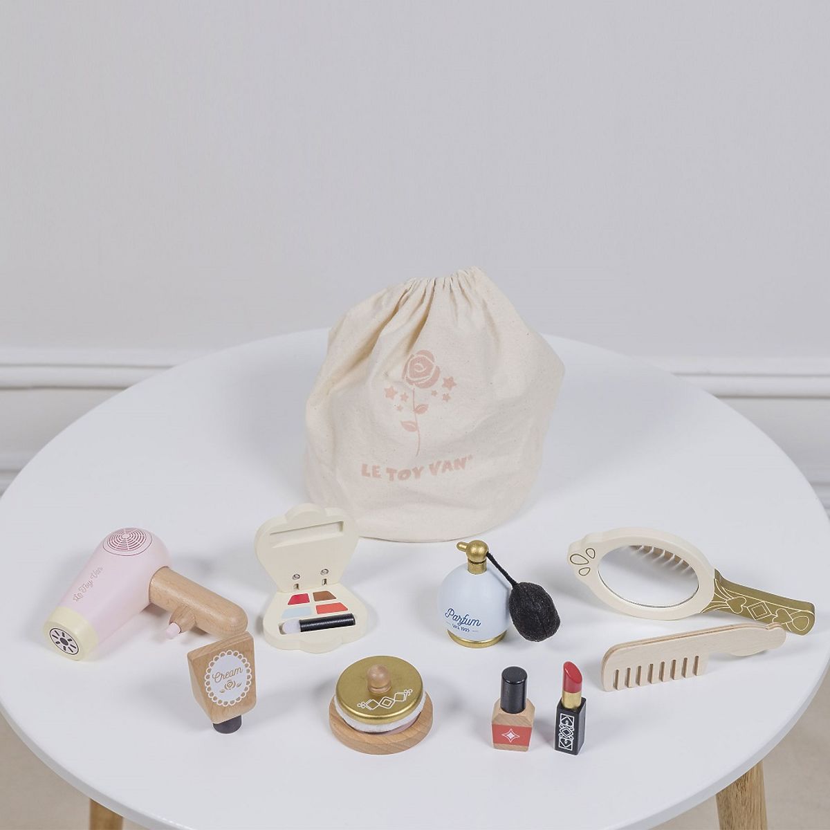 Kosmetická taška je snem každé malé vizážistky a kostyméra. Uvnitř najdete vše potřebné pro tvorbu úžasného make-upu a účesu – krém, oční stíny s aplikátorem, pudr s labutěnkou, parfém, rtěnku, fén, hřeben, zrcátko, lak na nehty a štěteček. Vše je krásně uloženo v praktickém textilním pytlíku, takže dokonalý make-up a účes lze tvořit kdykoliv a kdekoliv.
