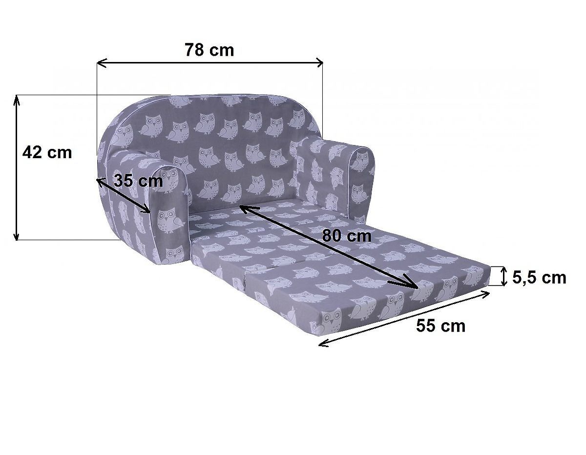 Pohovka po rozložení dosahuje délky až 80 cm a umožňuje pohodlné sezení pro dvě děti. Je ideální nejen do dětského pokoje, ale i do školek či herních prostor, kde přináší dětem radost a pohodlí během hraní i odpočinku.