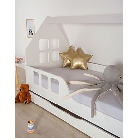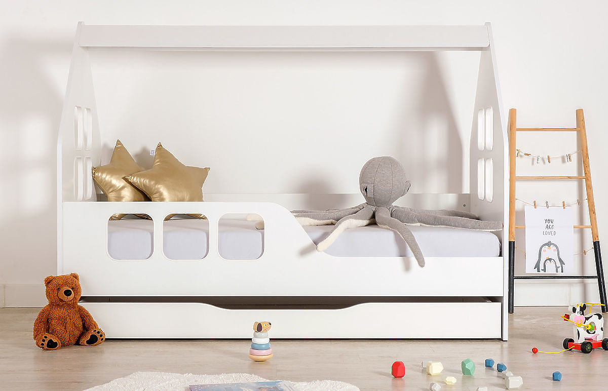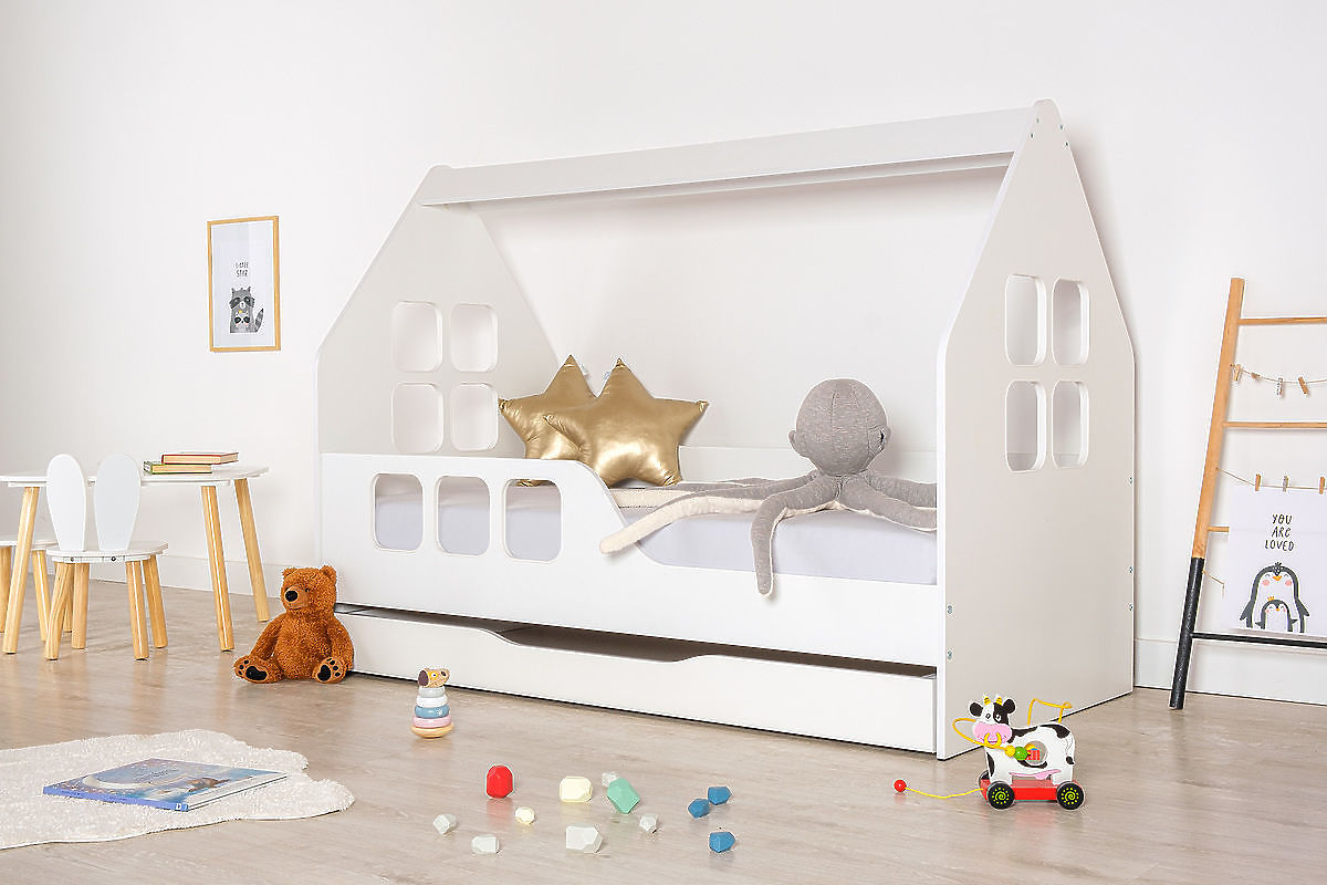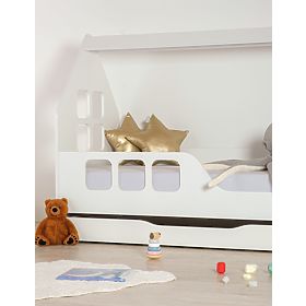 Bílá postel Woody ve tvaru domečku s okny o rozměru 160 x 80 cm. Toto originální provedení domečkové postele se stane krásnou dominantou dětského pokoje. Během dne splní funkci útulného koutku a v noci vytvoří bezpečné místo na spaní