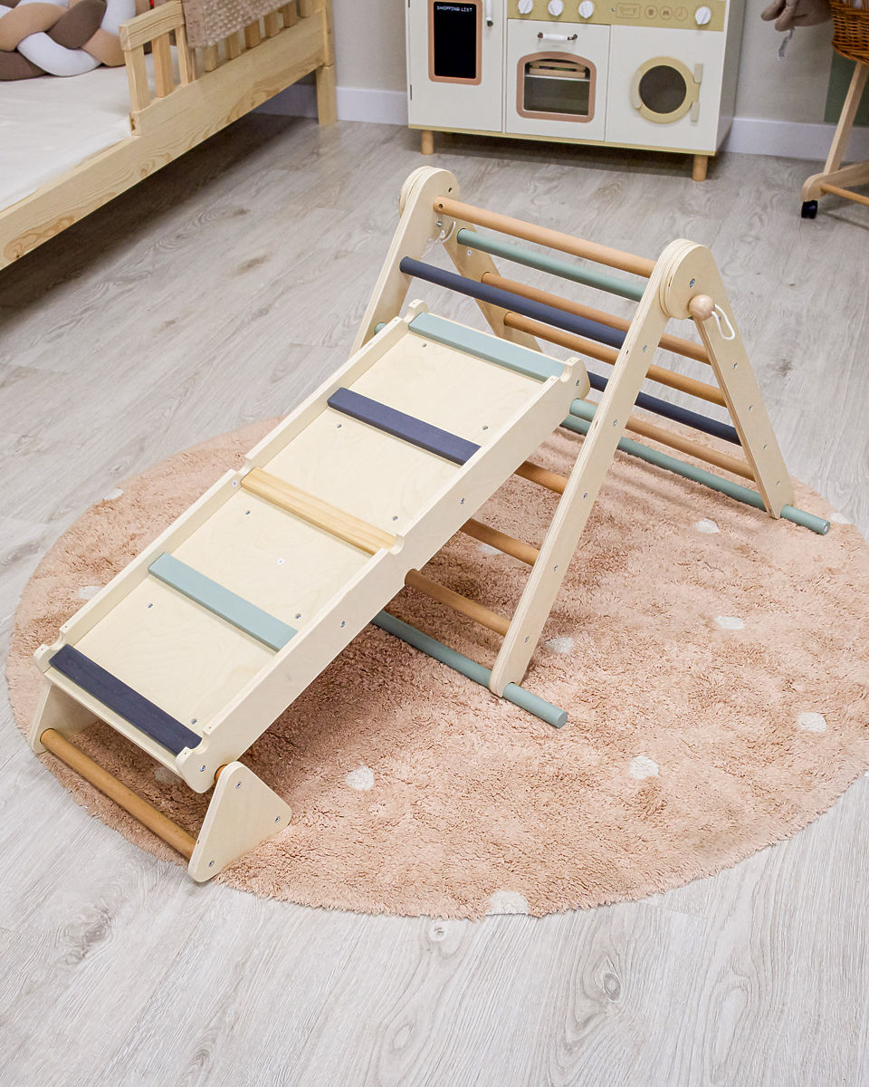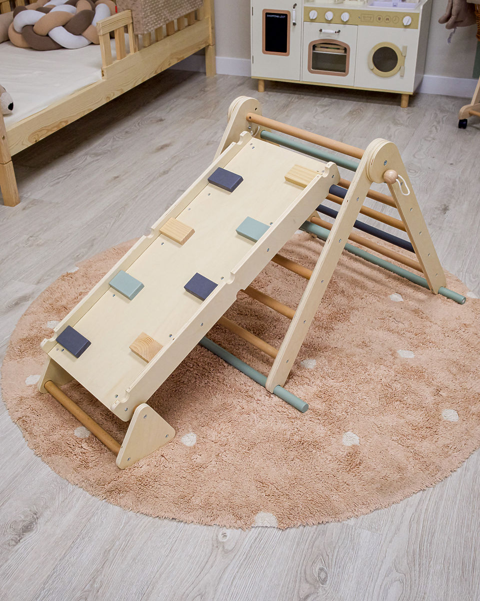 Piklerův trojúhelník Laura pro děti – zábavná a bezpečná hračka, která podporuje rozvoj motoriky, rovnováhy a kreativity. Díky pevné konstrukci z MDF dřeva může dítě lézt, podlézat, šplhat i sklouznout, což z trojúhelníku činí multifunkční herní prvek pro aktivní hru doma i v herně.