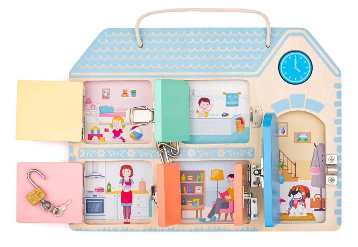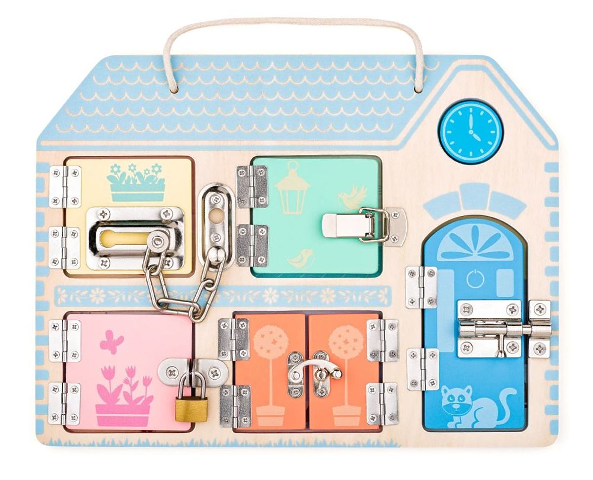 Dětská dřevěná tabule s pěti typy zámků pro rozvoj motorických dovedností a trpělivosti. .. více