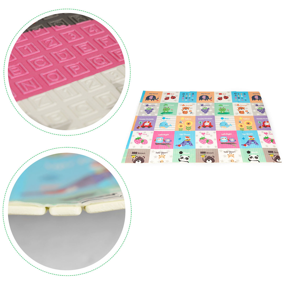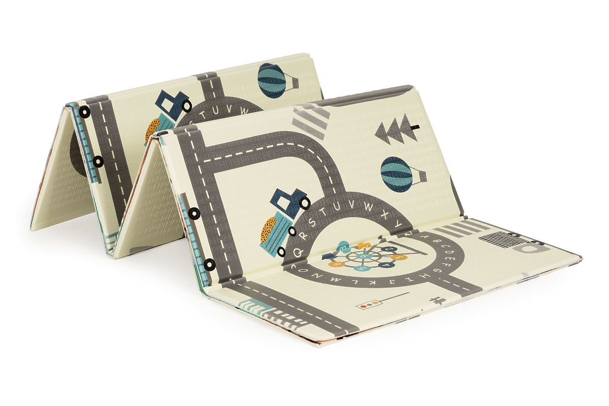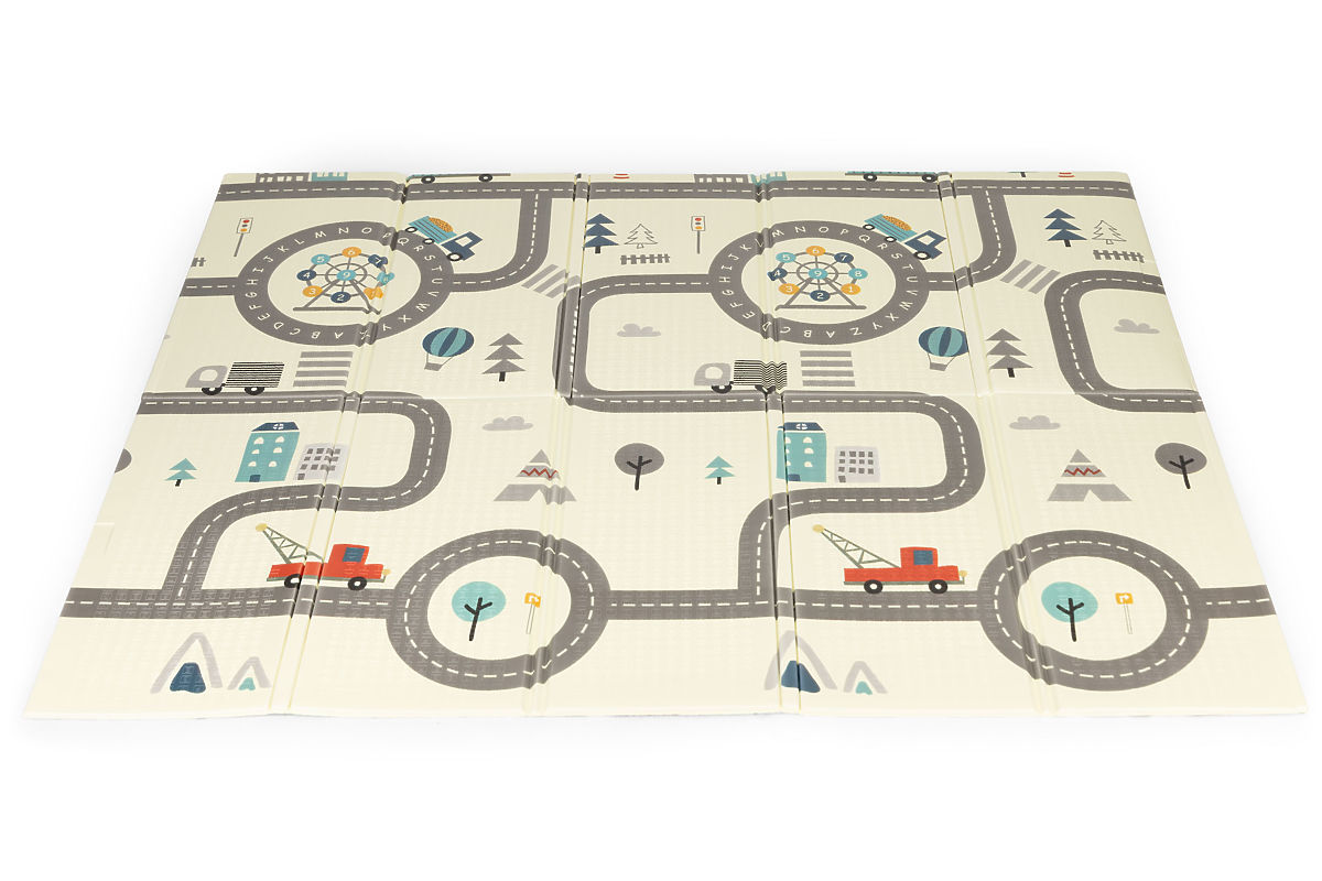 DŮRAZ NA BEZPEČNOSTPodložka je mimořádně praktická, lze ji snadno skládat a rozkládat, což usnadňuje její skladování a přenášení. Dvě strany poskytnou spoustu zábavy, na jedné straně se nachází grafika města s ulicemi, na druhé straně jsou umístěny barevné grafiky zobrazující různá zvířátka a ovoce.