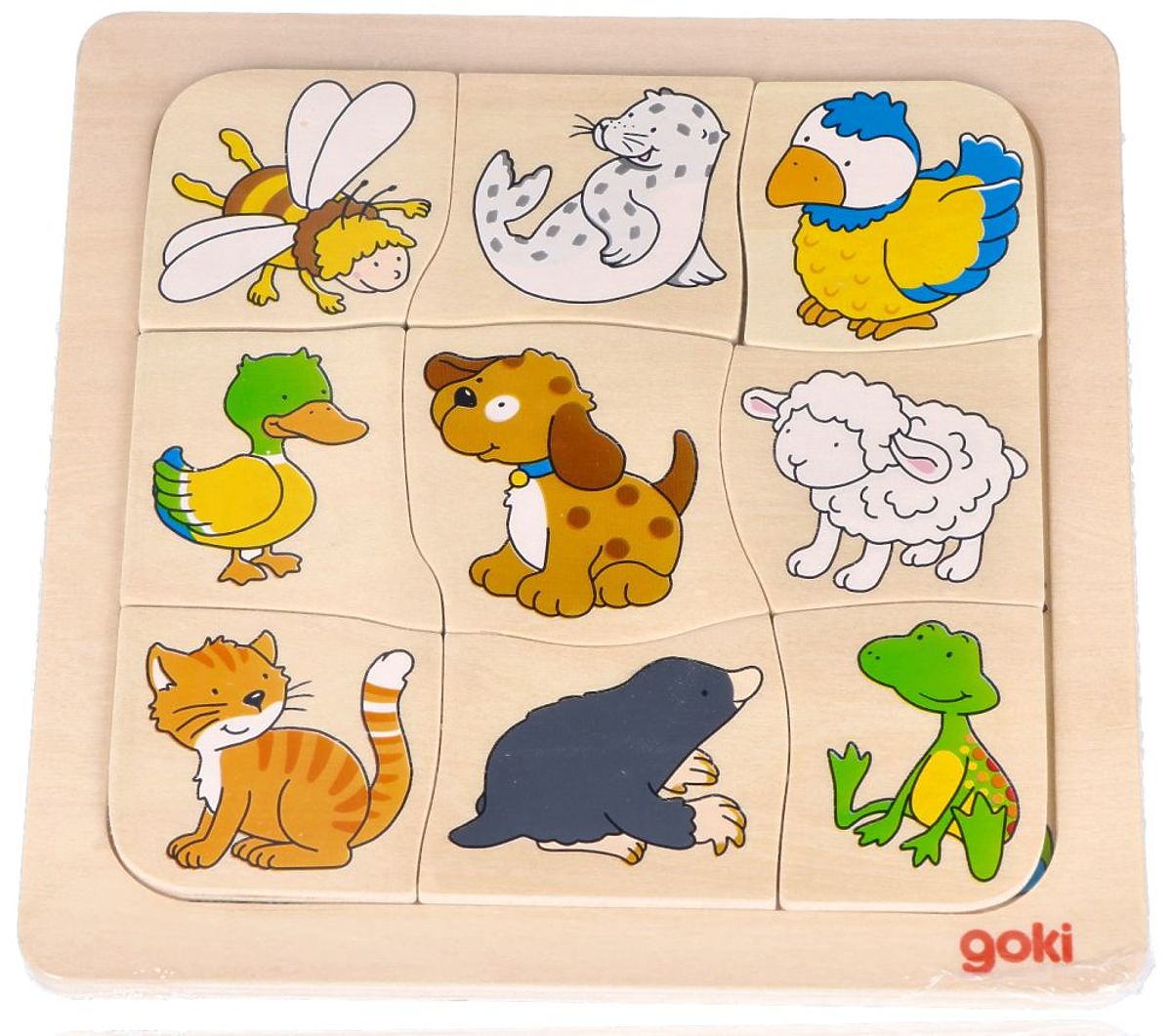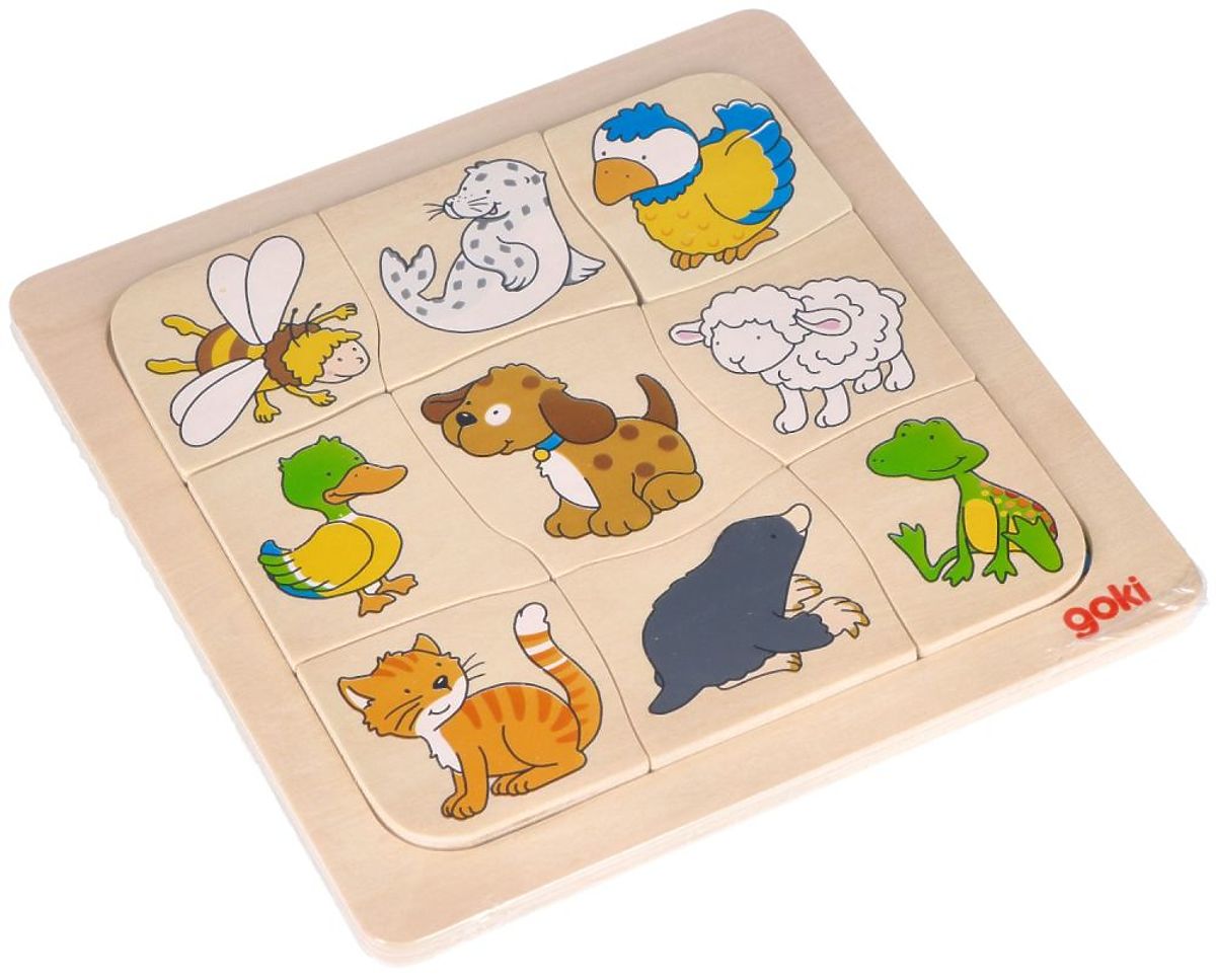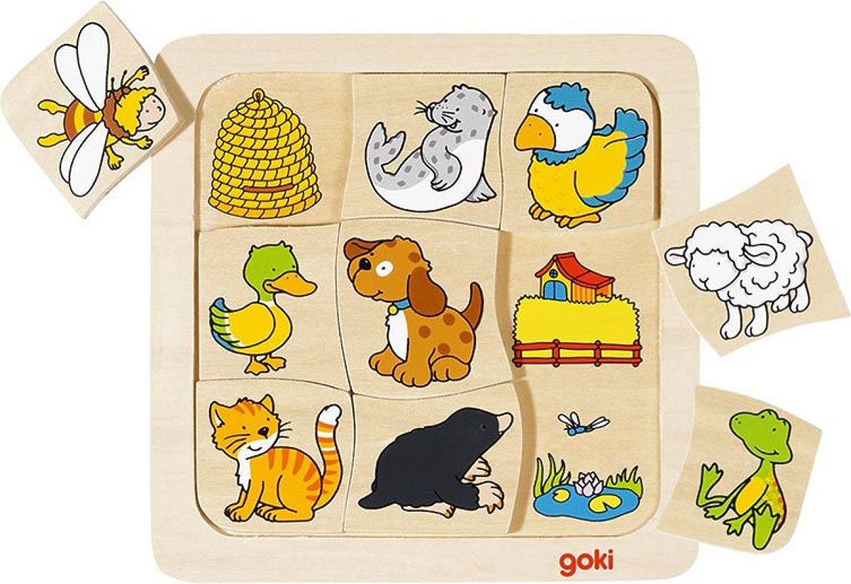 Dřevěná skládačka s devíti zvířátky hledajícími své domovy. .. více