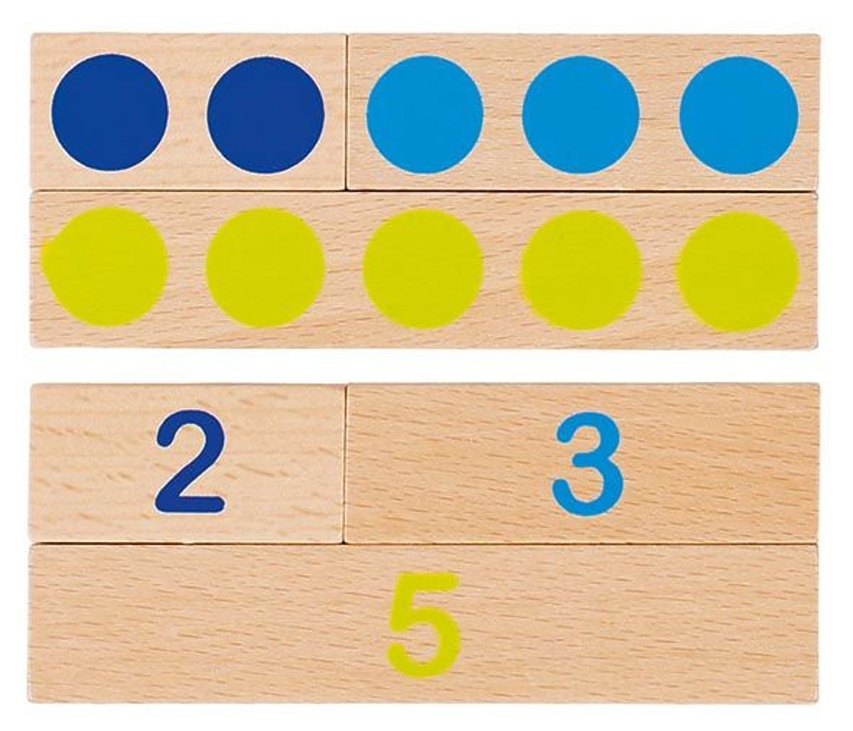 Dřevěné kostky s čísly a barevnými tečkami pro učení počítání. .. více