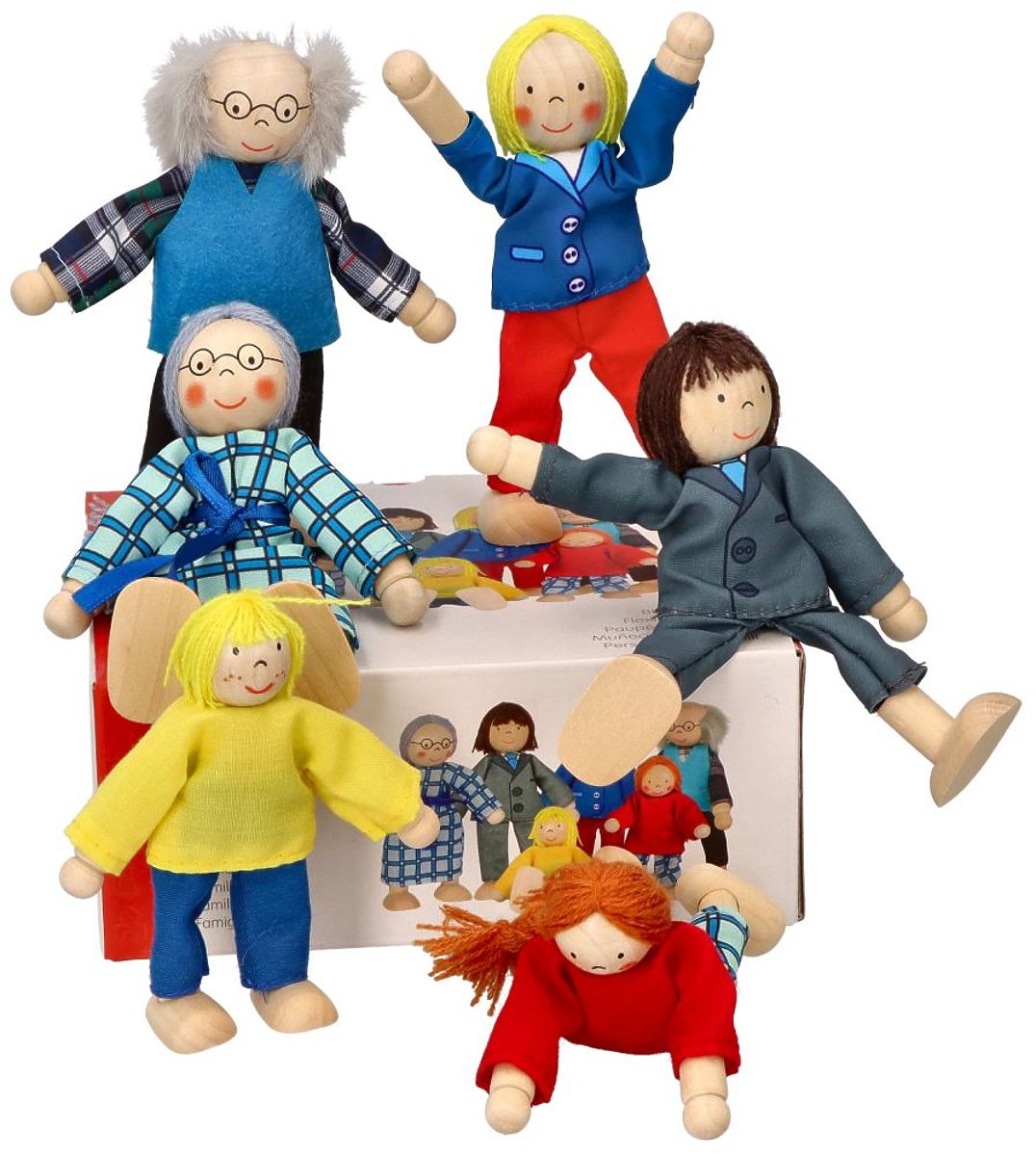 Zábavná, dřevěná rodinka loutek, je ideálním doplňkem do domečků pro panenky a sad nábytku.