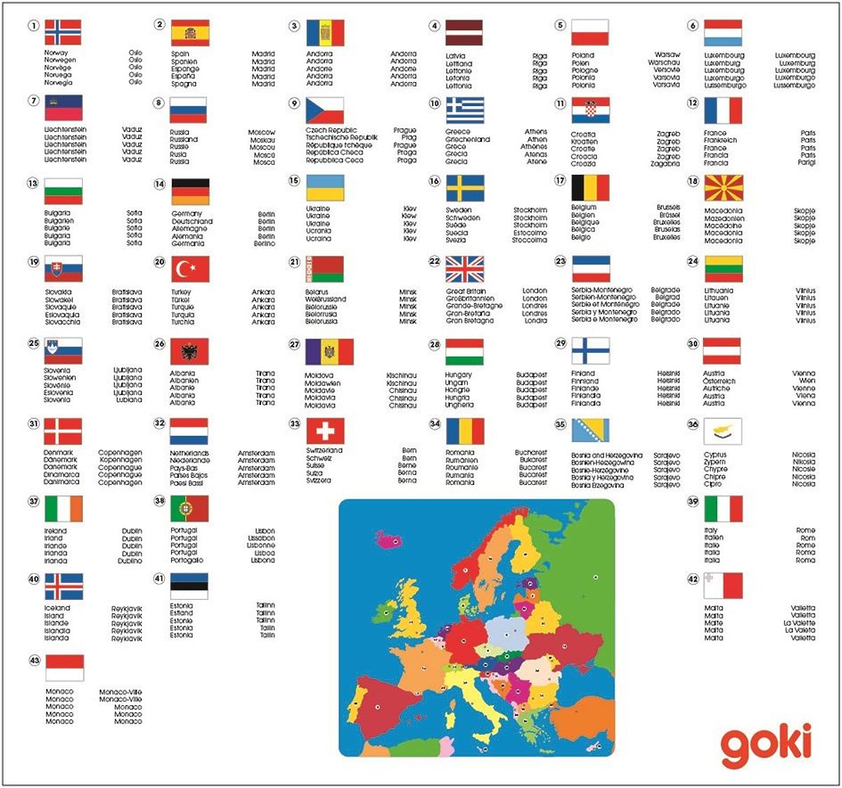 Státy na mapě jsou označeny čísly a čtvercem je označeno umístění hlavního města. V sadě je list s vysvětlením, které číslo odpovídá kterému státu, díky čemuž se lze bavit hádáním. Názvy na listu jsou napsány v pěti jazycích, včetně angličtiny (polština chybí, ale bez problémů každý uhodne, o který stát jde). Navíc na taháku je vlajka každého státu a název hlavního města.