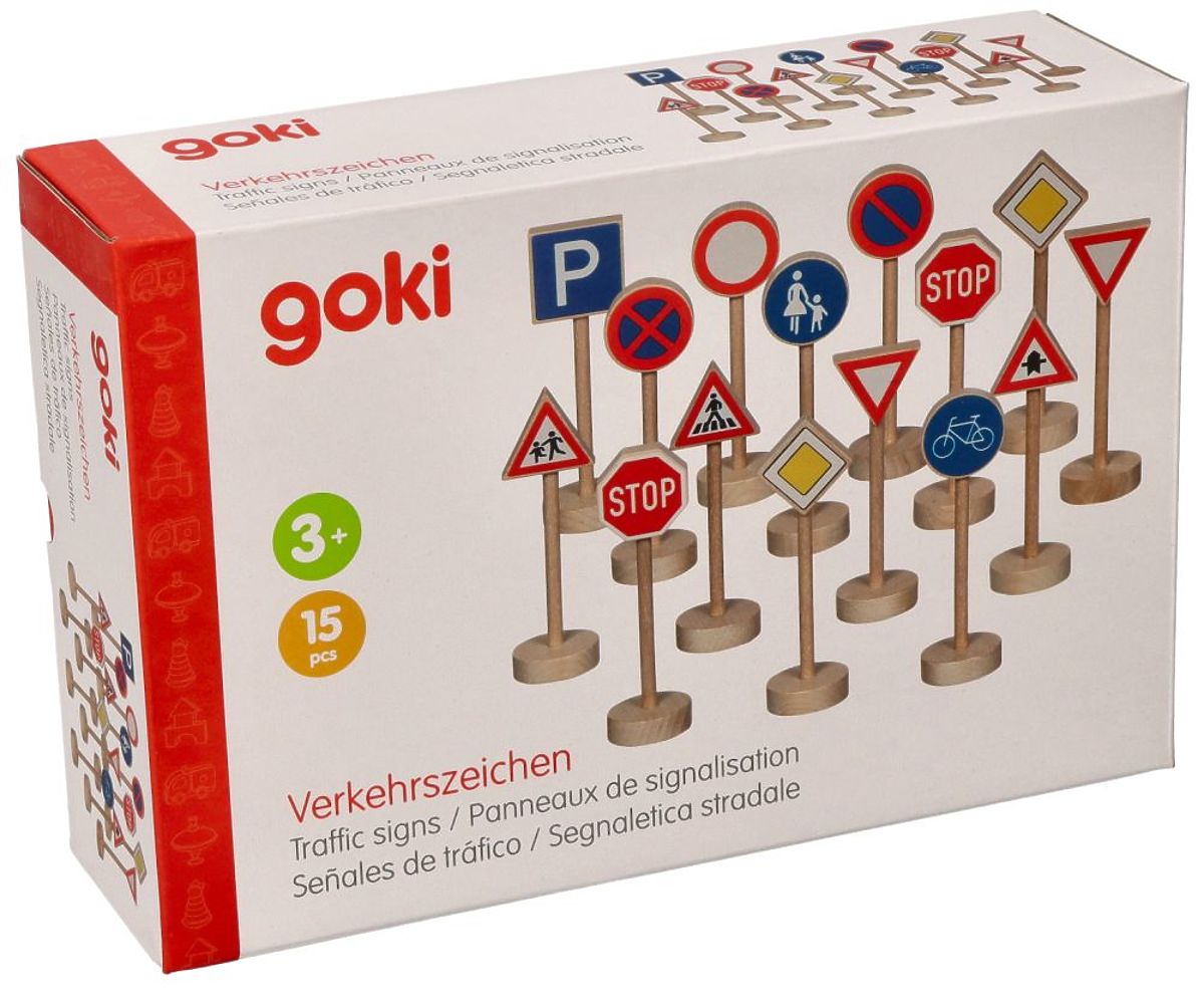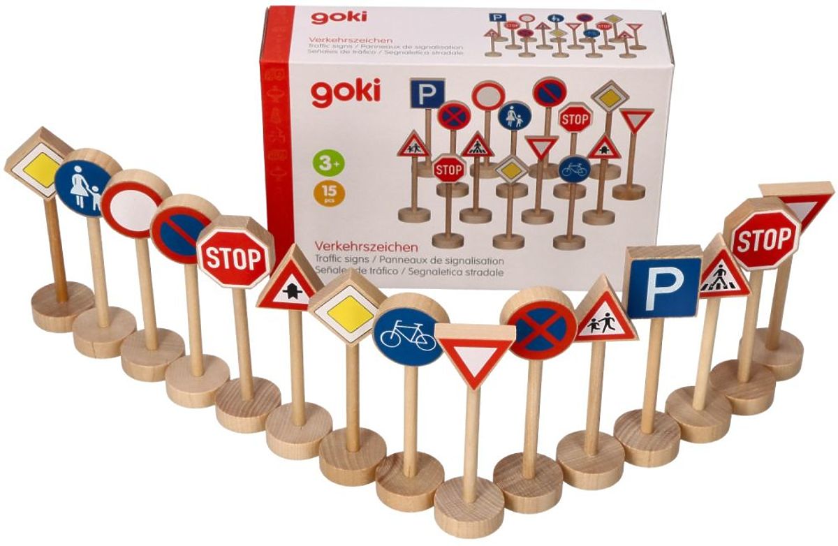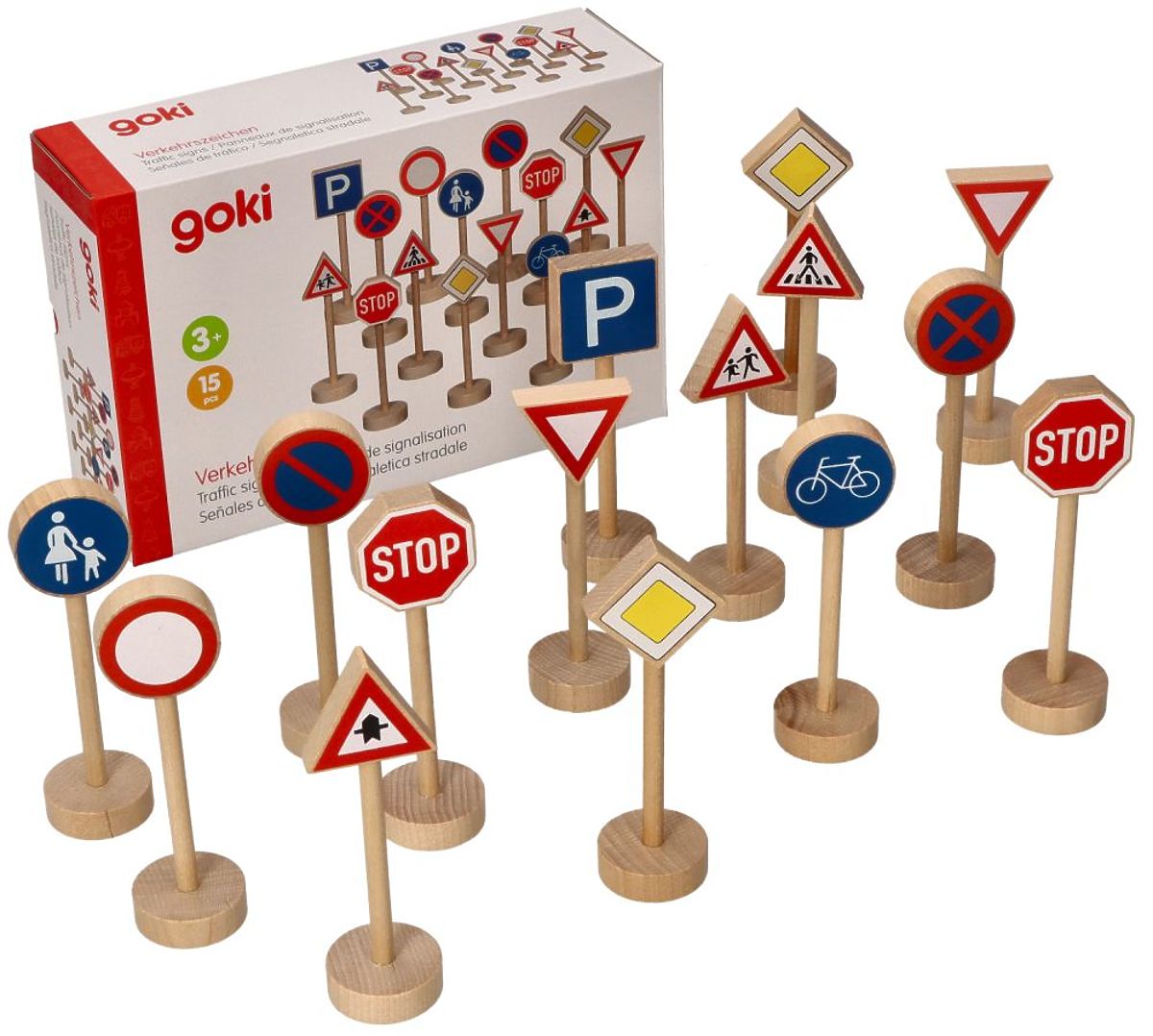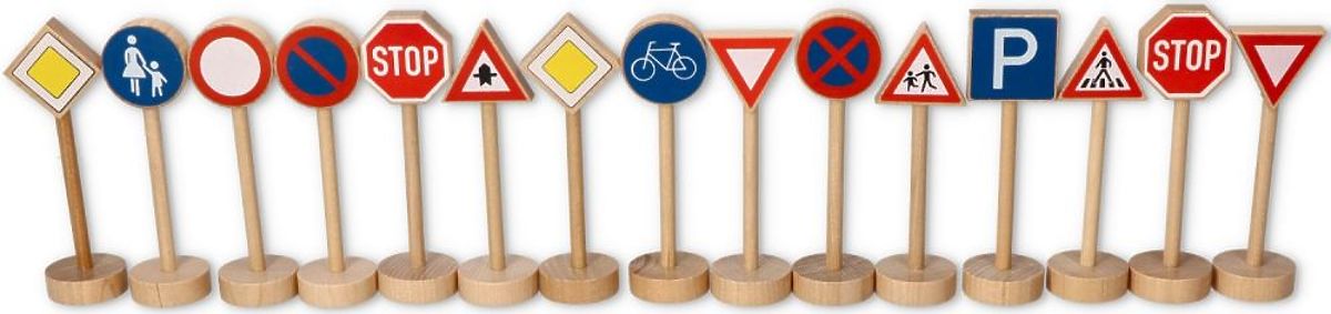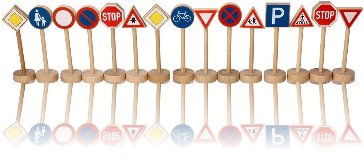 Sada dřevěných dopravních značek se hodí jako didaktická pomůcka, ale také jako skvělá zábava. Sestavte si vlastní cesty např. z dřevěných kostek od Jenga nebo jiných, rozmístěte značky a hrajte si na skutečnou jízdu, přičemž se učíte význam jednotlivých značek. Sada obsahuje 15 značek vyrobených z pevného bukového dřeva. V sadě jsou základní výstražné, informační a zákazové značky.