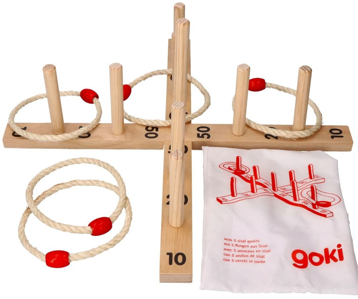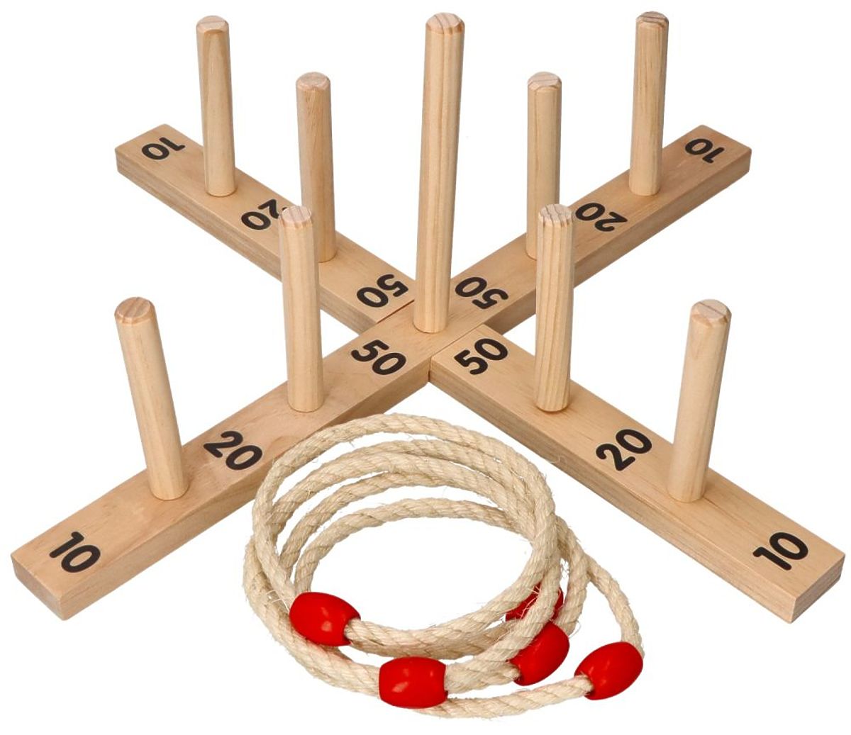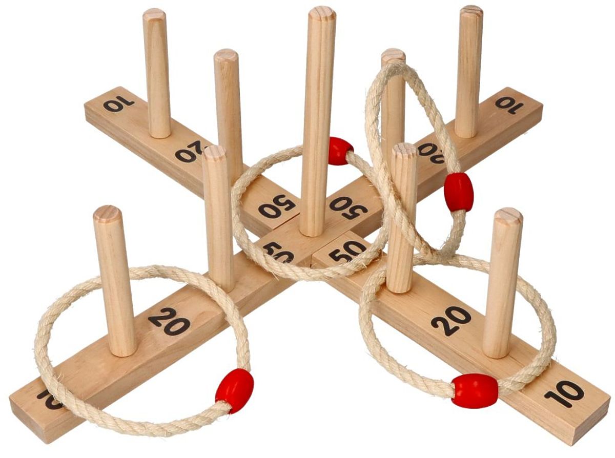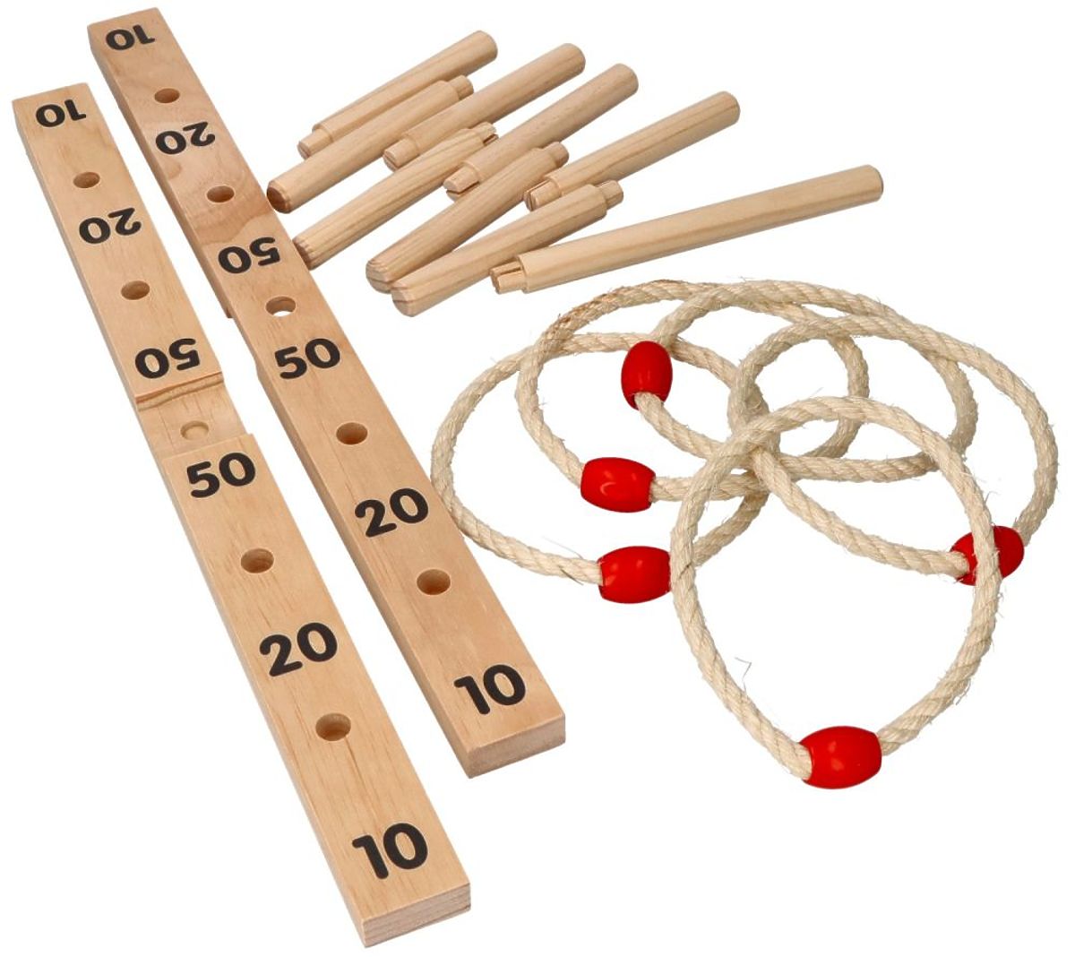 Hra se skládá ze základny - kříže, na které je 9 sloupků a pěti kroužků. Základna je vyrobena zcela ze dřeva. Kroužky jsou vyrobeny z provazu spojeného dřevěným prvkem. Věk: 3+ Rozměry: 56 x 56 cm. Reference: SA059 Prohlášení o shodě CE