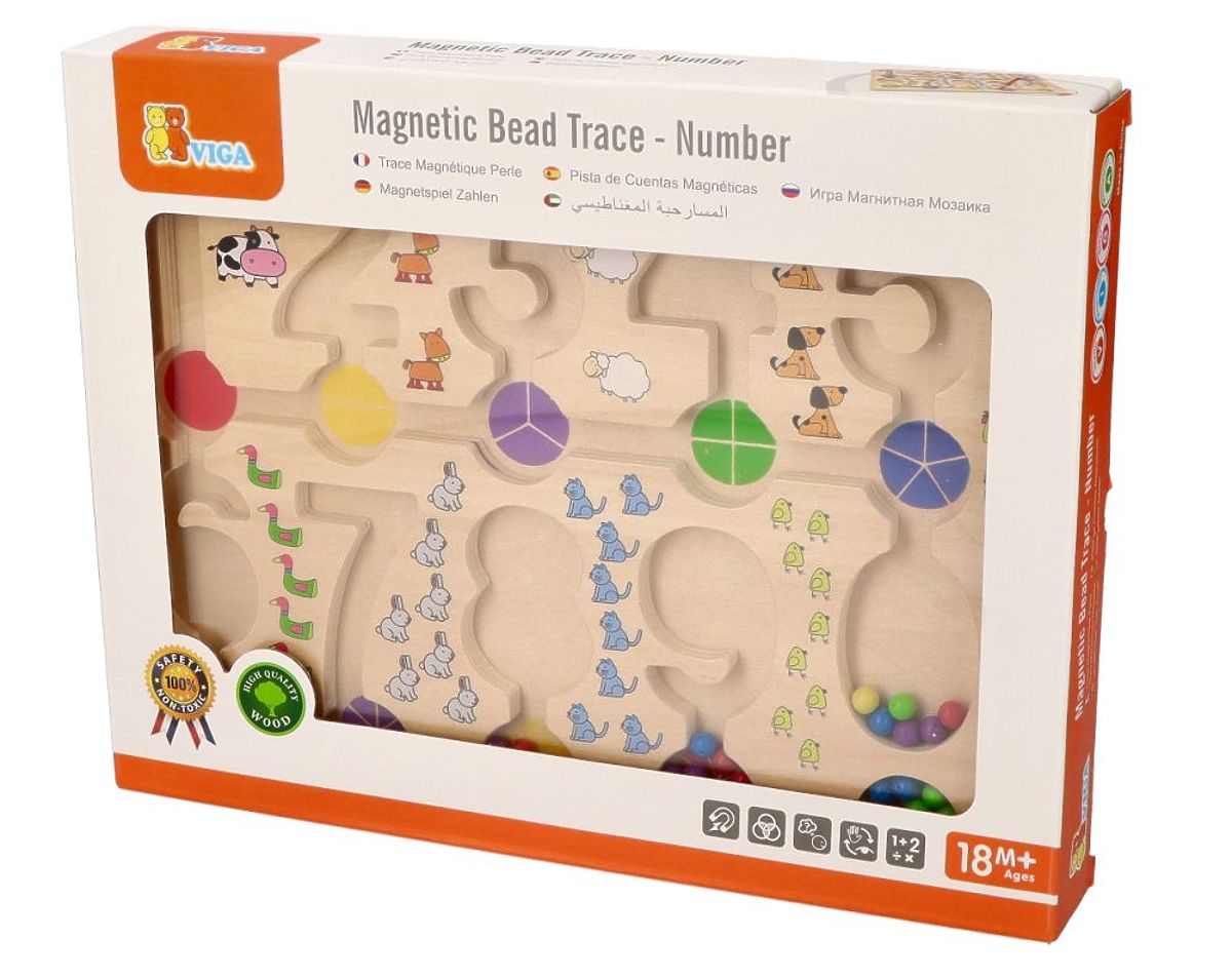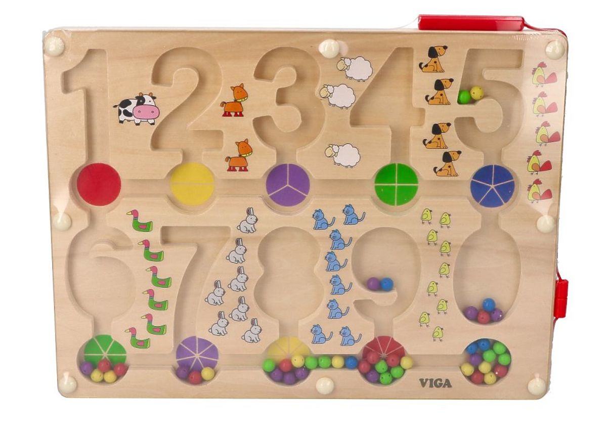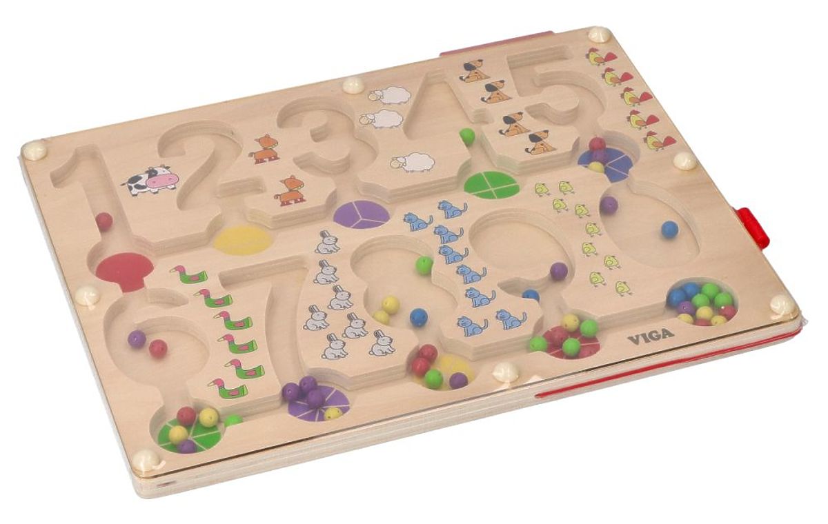 Na dřevěný podklad s bludištěm je položeno průhledné plastové krytí. Po přiložení magnetické tyčinky k plastu mohou děti posouvat kuličky v bludišti. Kuličky lze vést libovolně, ale také je lze umístit do prohlubní s číslicemi tak, aby počet kuliček odpovídal dané číslici. Kuličky jsou uzavřené, takže nevypadnou a neztratí se. Součástí je magnetická tyčinka.