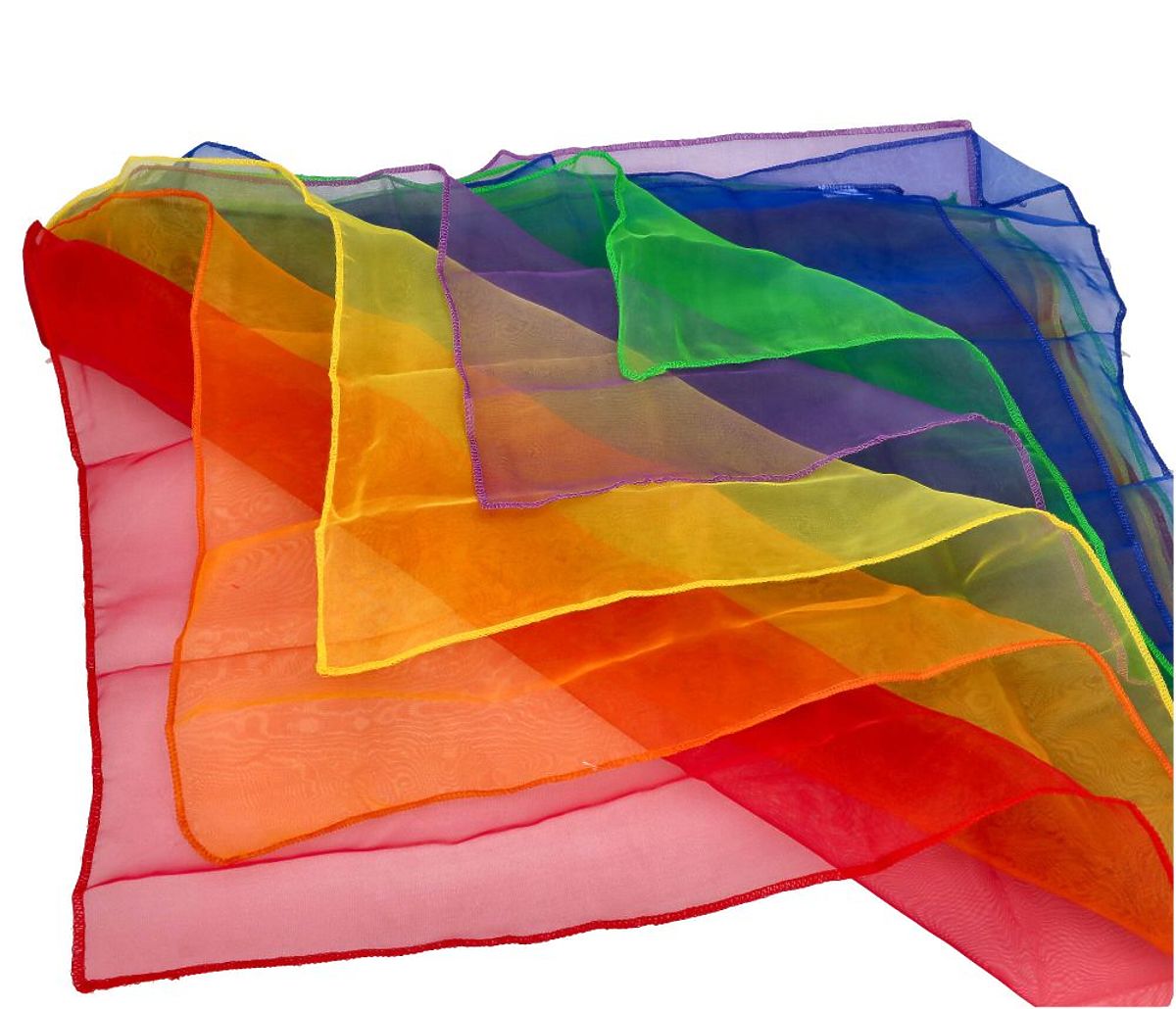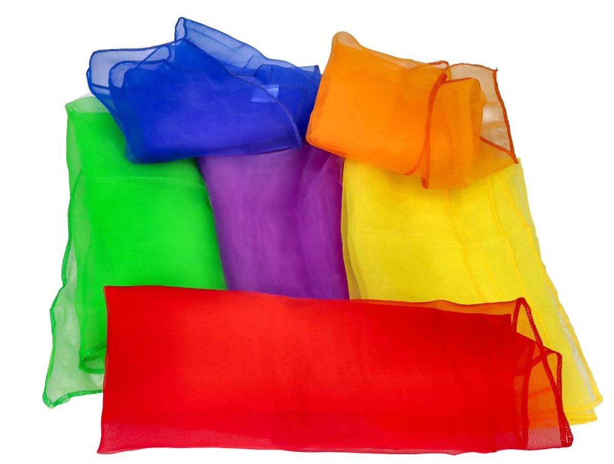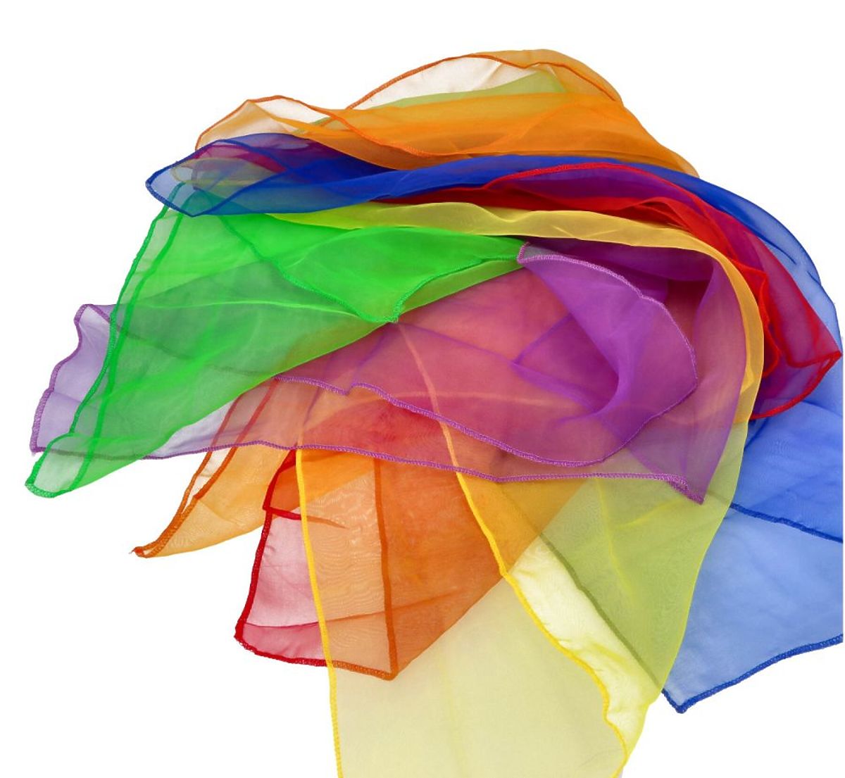 Představujeme sadu barevných šátků pro pohybové hry. Jemně lesklé šátky v šesti barvách duhy jsou ideální pro házení, učení se žonglování a další pohybové hry. Můžete si s nimi hrát mnoha různými způsoby.