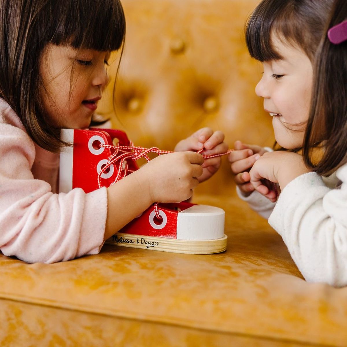 Klasická dřevěná teniska je multifunkční hračka. Díky této hračce dítě nejen získává zručnost ve vázání mašliček, ale také může cvičit trefování do dírky a provlékání šňůrky - zejména pro mladší děti. Hračka navíc procvičuje trpělivost a koordinaci pohybově-zrakovou, a také manuální zručnost, protože dítě může provlékat tkaničky skrz dírky.