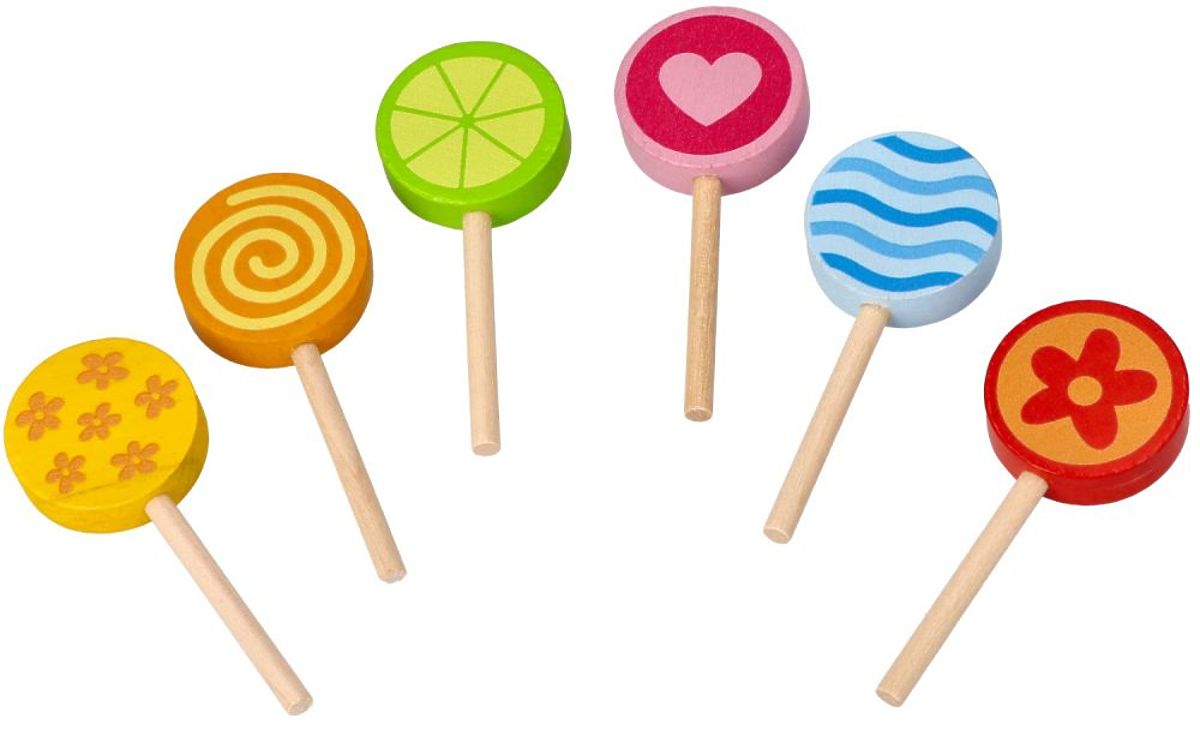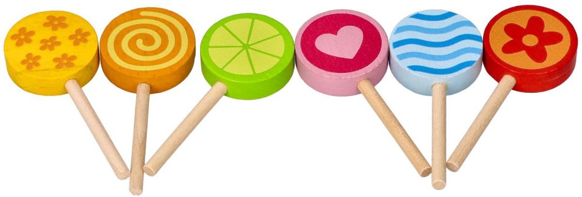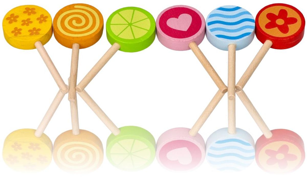 V sadě najdete 6 kusů barevných, dřevěných lízátek. Každé z nich je jiné, aby si každý mohl vybrat svou oblíbenou příchuť.
