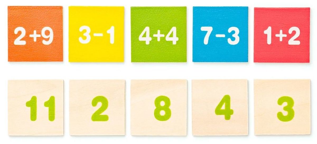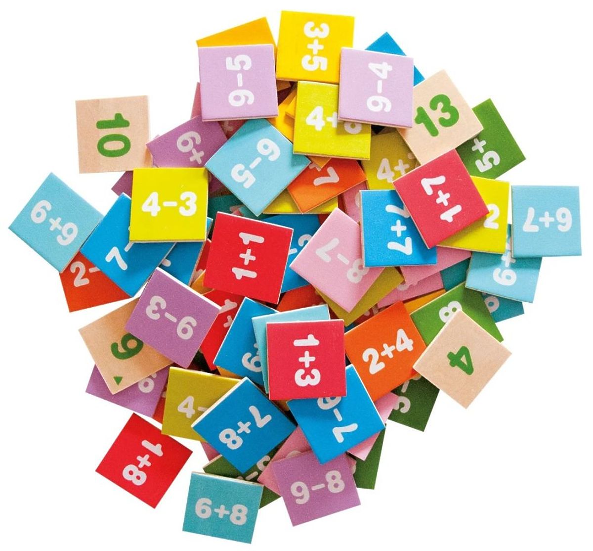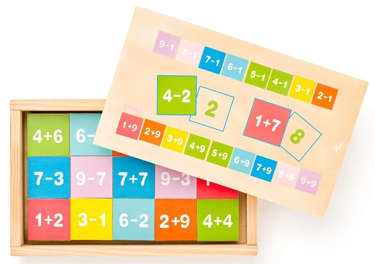 V dřevěném balení se nachází 81 dřevěných destiček, na kterých je z jedné strany úkol a z druhé řešení. Stačí otočit destičku a výsledek se objeví před očima dítěte. Každé číslo má přiřazenou jinou barvu, což činí destičky atraktivnějšími. Nyní sčítání a odčítání nebude jen učením, ale i zajímavou zábavou. Můžete také uspořádat kvíz. Díky spojení obrázku a pohybu bude učení snazší. Je to nejlepší způsob, jak se učit.