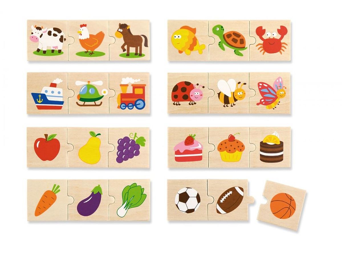 Sada obsahuje 24 dřevěných kostek rozdělených do 8 tematických skupin po třech puzzlích: