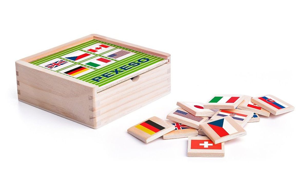 V této jednoduché hře se dítě musí soustředit, aby našlo odpovídající obrázky. Další výhodou je dřevěné provedení hračky. Jak kostky, tak i krabička, do které jsou zabaleny, jsou dřevěné. Díky tomu přežijí nejednu potyčku a vždy budou na svém místě. A až se naučíte hrát, můžete se také začít učit, která vlajka patří ke které zemi.