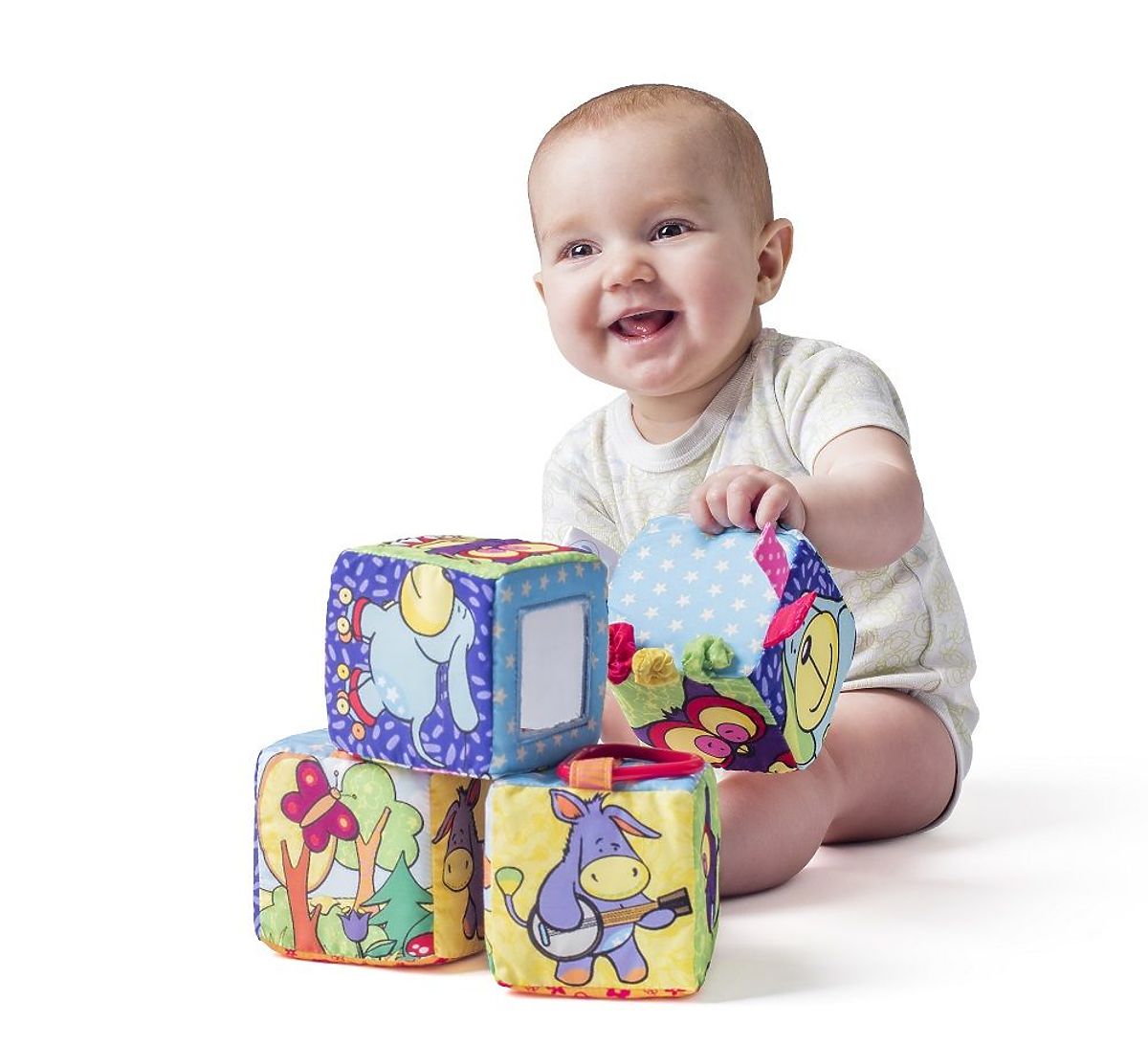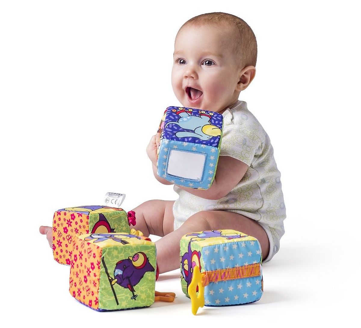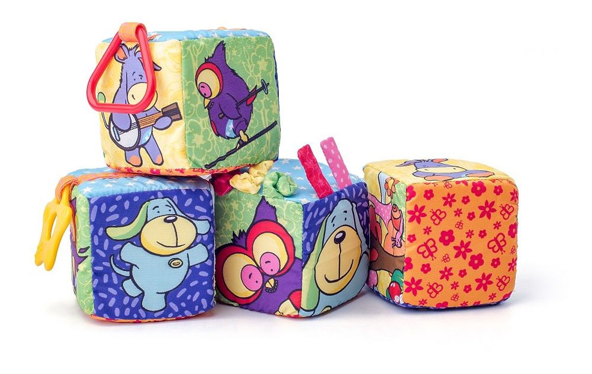 Barevné, měkké kostky jsou multifunkční hračkou pro nejmenší. Díky skrytým různým atrakcím si s kostkami lze hrát různými způsoby.