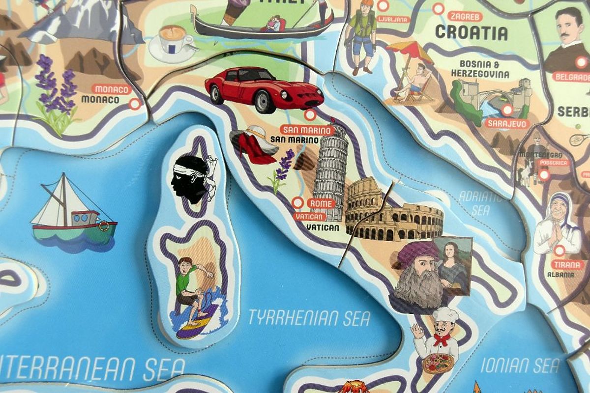 Dítě se prostřednictvím hry učí velikost, tvar a umístění jednotlivých evropských zemí. Mapa zobrazuje náš kontinent od daleké ruské tundry přes blízkovýchodní pustiny až po Islandii. Každá země (s výjimkou států jako Vatikán, Andorra, Lichtenštejnsko, Malta a Monako) má zajímavé obrázky spojené s kulturou, historií nebo památkami dané země. Čím větší země, tím více obrázků se nachází v jejích hranicích. Například v Polsku můžeme najít slavného polského papeže Jana Pavla II. nebo hrad v Malborku, zatímco v Anglii můžeme vidět slavné Stonehenge nebo červený dvoupatrový autobus. Totéž platí pro magnetické puzzle, kde země jako Portugalsko se skládají z jednoho dílu, zatímco Rusko má až 10 puzzlí. Od této chvíle každé dítě bude vědět, s jakými státy sousedí Polsko, nebo přes které státy je třeba jet, aby se dostalo na dovolenou do slunné Itálie.
