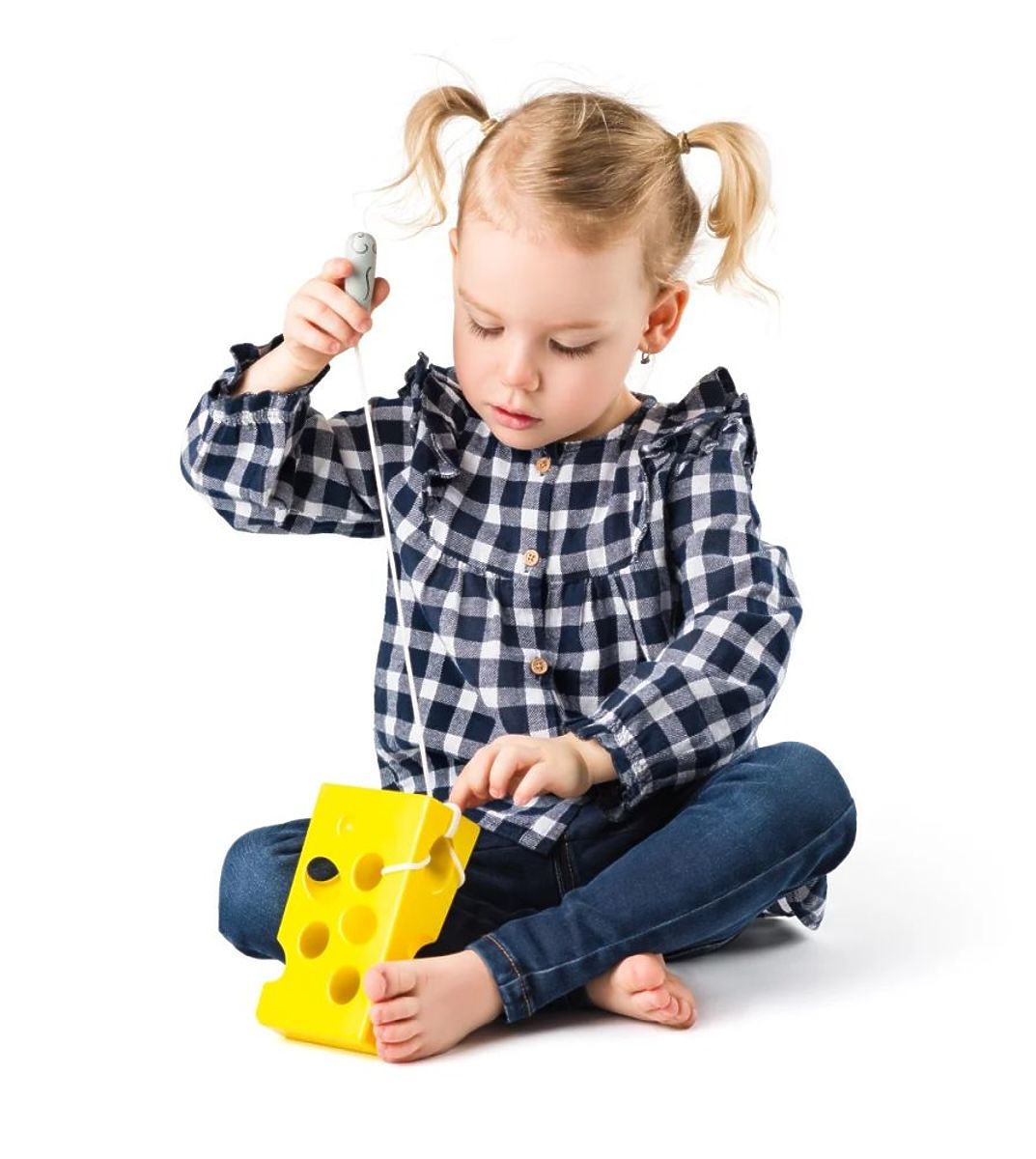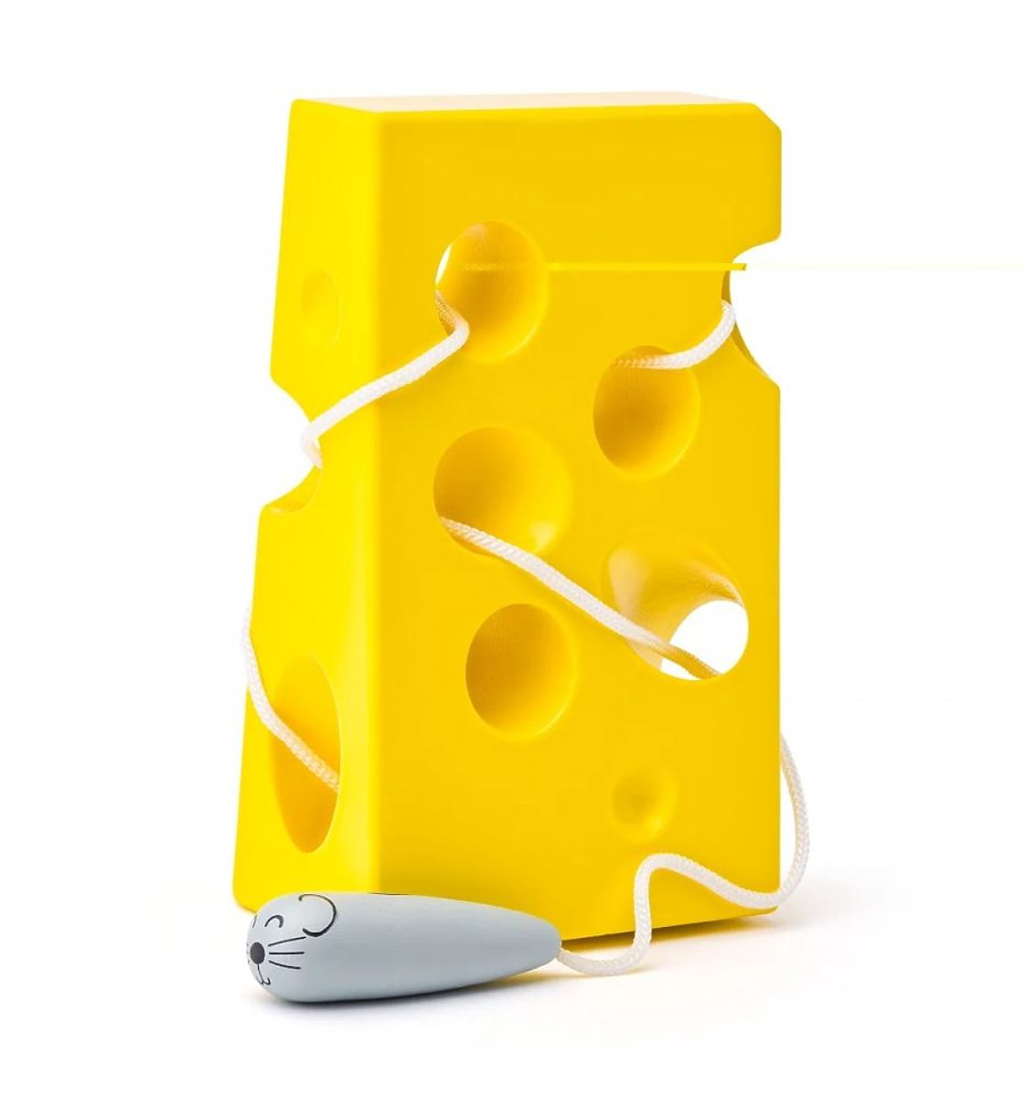 Podívejte se, jak myšce chutná tento sýr. Hra spočívá v proplétání přátelské myšky, ke které je připevněn provázek, skrz připravené otvory v sýru. V sýru je 6 dírek, zatímco délka provázku umožňuje libovolně proplétat myšku po celém sýru. Dřevěná myška ve tvaru zaobleného kužele s velkou chutí prokousne chutný kousek sýra :)