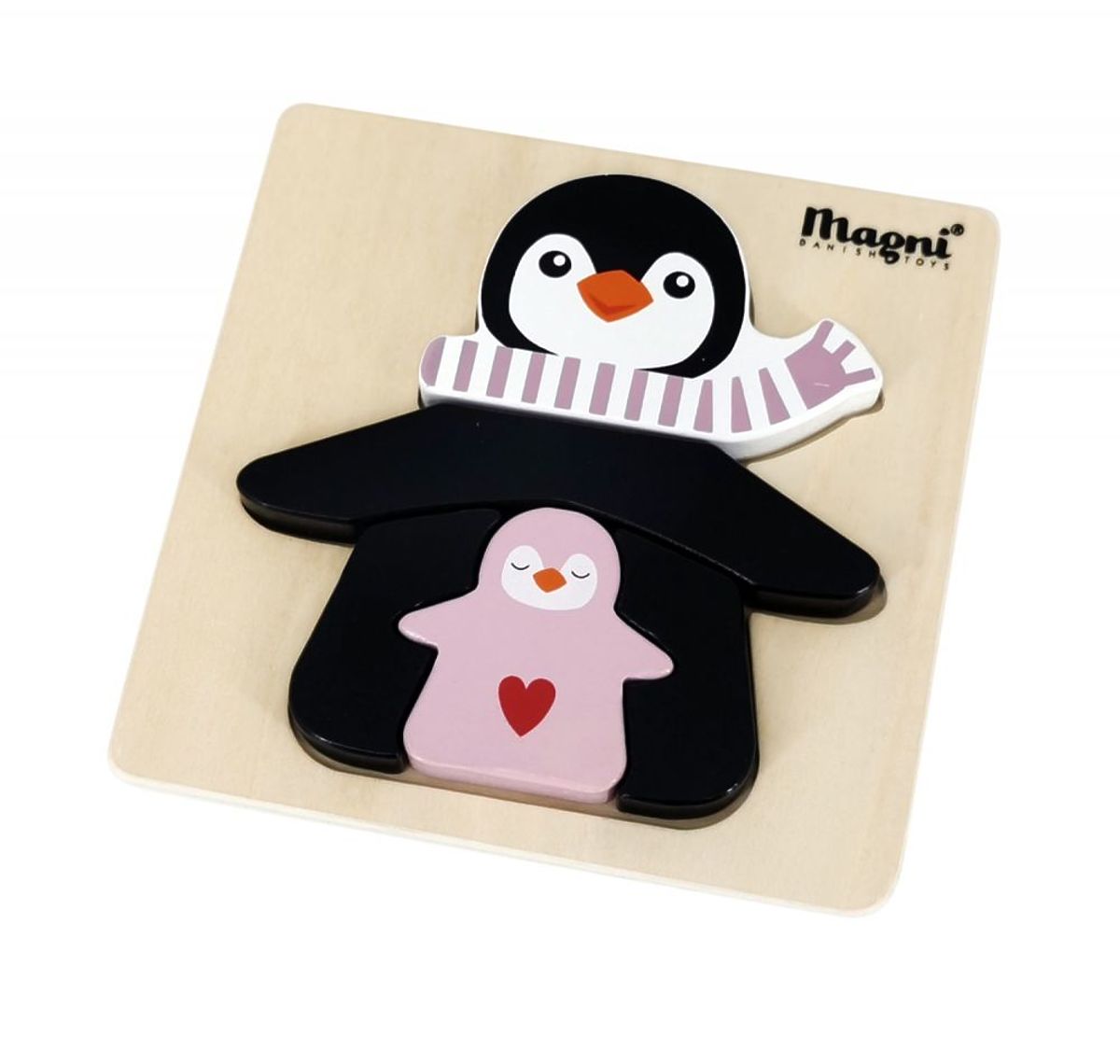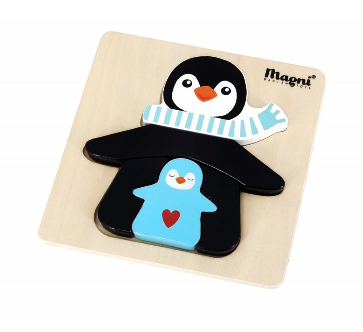 Puzzle Tučňák s mláďaty od známého výrobce hraček Magni je skvělou formou vzdělávání, která zlepšuje manuální dovednosti a rozvíjí koordinaci ruka-oko, a zároveň i představivost dítěte. Zvířátka umožní dítěti vytvářet nové, kreativní příběhy a v tomto případě máme k dispozici puzzle s maminkou tučňákem a tatínkem tučňákem. To určitě bude mít skvělý vliv na rozvoj dětské představivosti.