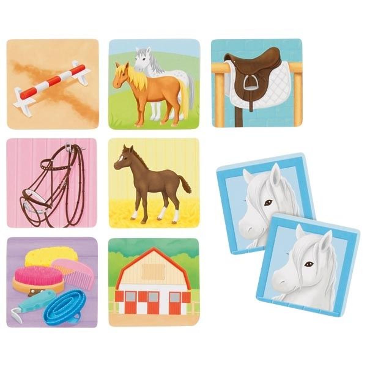 Klasické dřevěné pexeso tentokrát s krásnými obrázky z koňského světa. Každý milovník koní okamžitě rozpozná všechny skryté prvky spojené s jezdectvím. Kromě koní zde najdou vše, s čím se mohou setkat ve stáji, včetně budovy, překážek, uzdy, sedla a sady kartáčů.