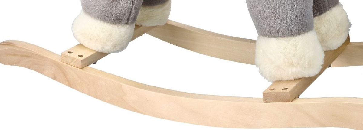 Krásný koník je vyroben z měkkého plyšového materiálu v šedé barvě s bílými doplňky jako hřívou, čumákem a ocáskem. Uzda a sedlo jsou vyrobeny v šedé barvě. Lyžiny a rukojeti jsou z lehkého a příjemného na dotek dřeva.