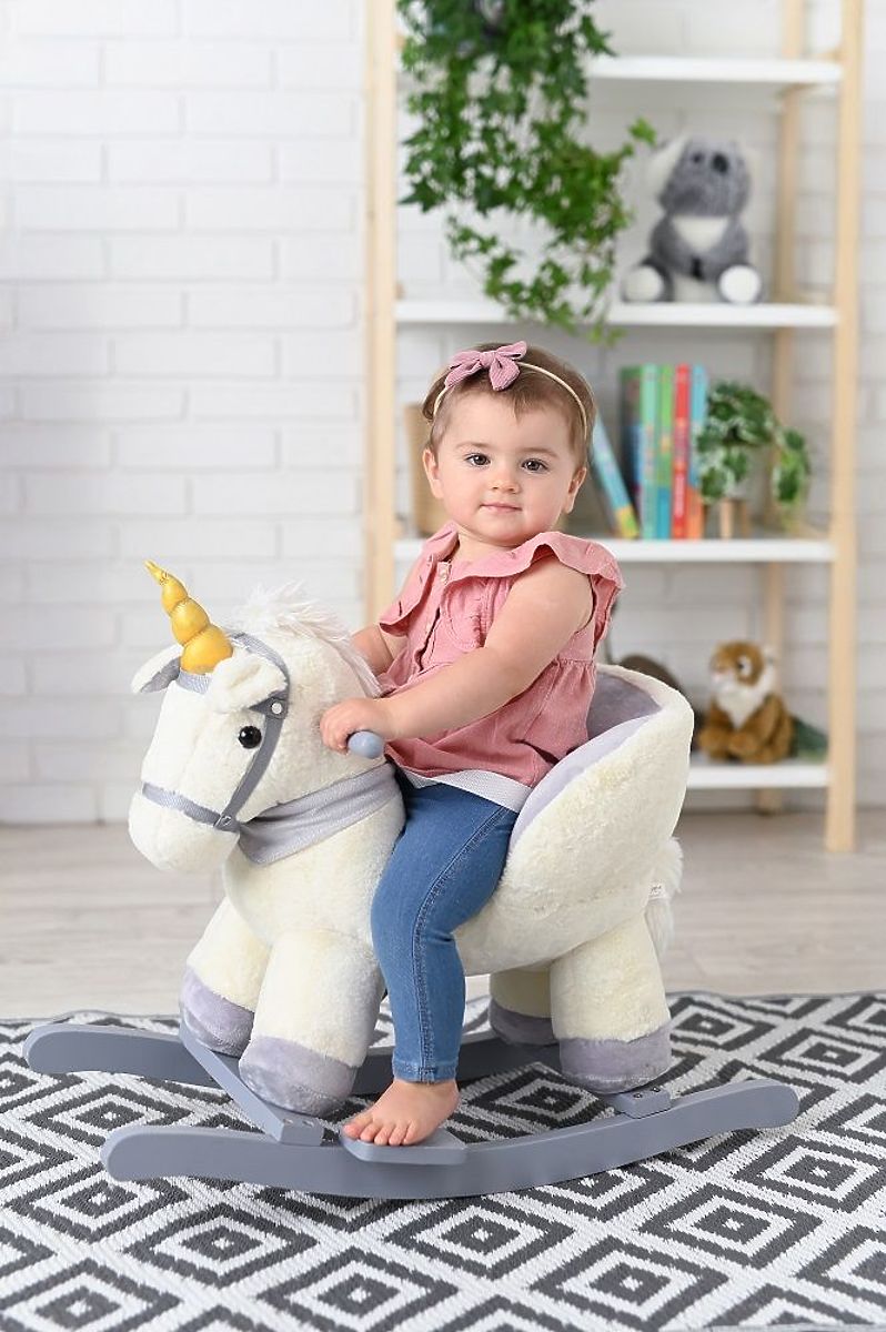 Sympatický houpací jednorožec se nemůže dočkat svého nového kamaráda. Vaše dítě se pohodlně usadí v plyšovém křesílku, aby se vydalo na dalekou cestu plnou dobrodružství se svým sladkým koníkem :)