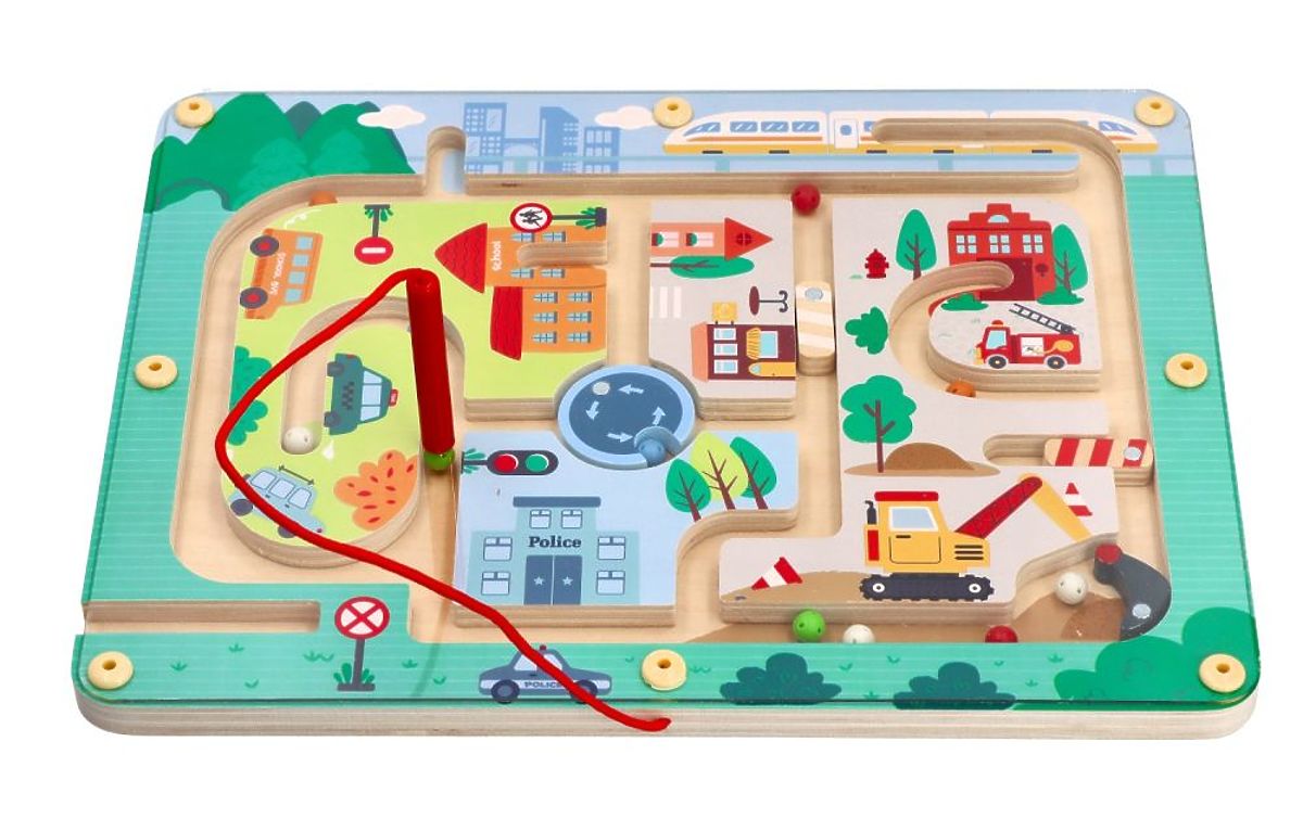 Magnetické bludiště je dřevěná deska s krásným potiskem, na kterou je položeno průhledné plastové sklíčko. Společně zabraňují vysypání kuliček ven. Magnetická tyčinka připojená k základně a spojená s ní šňůrkou má také své místo. Navíc mají kuličky dírky, což je činí lehkými a snadno pohyblivými. Skvělá kvalita za dobrou cenu.