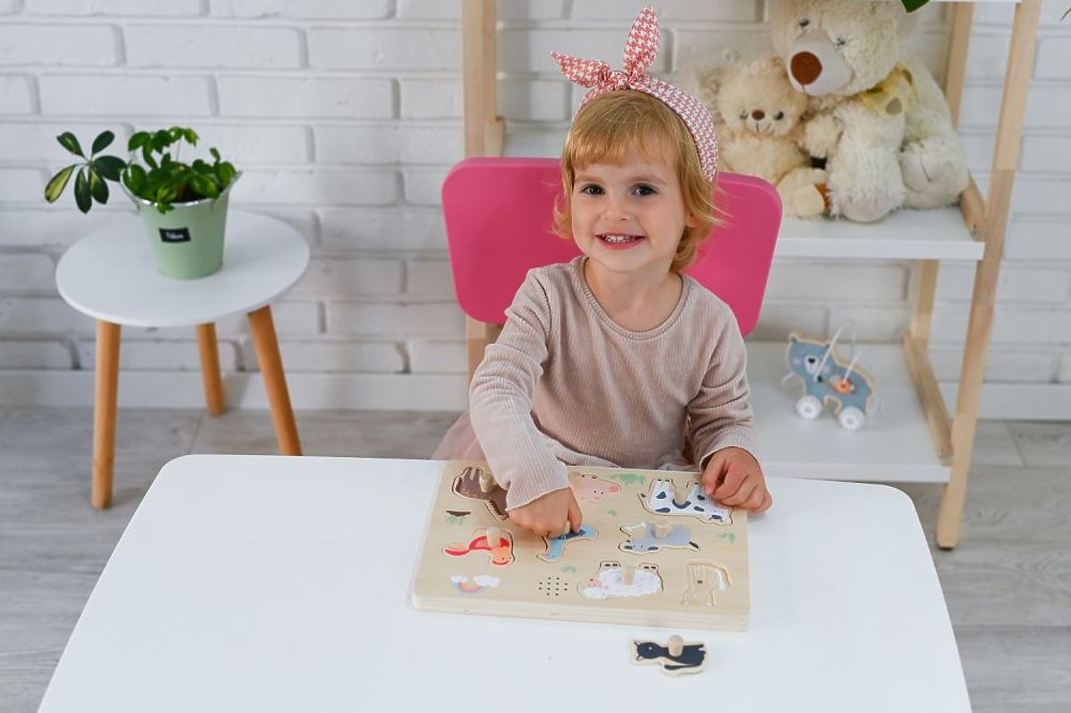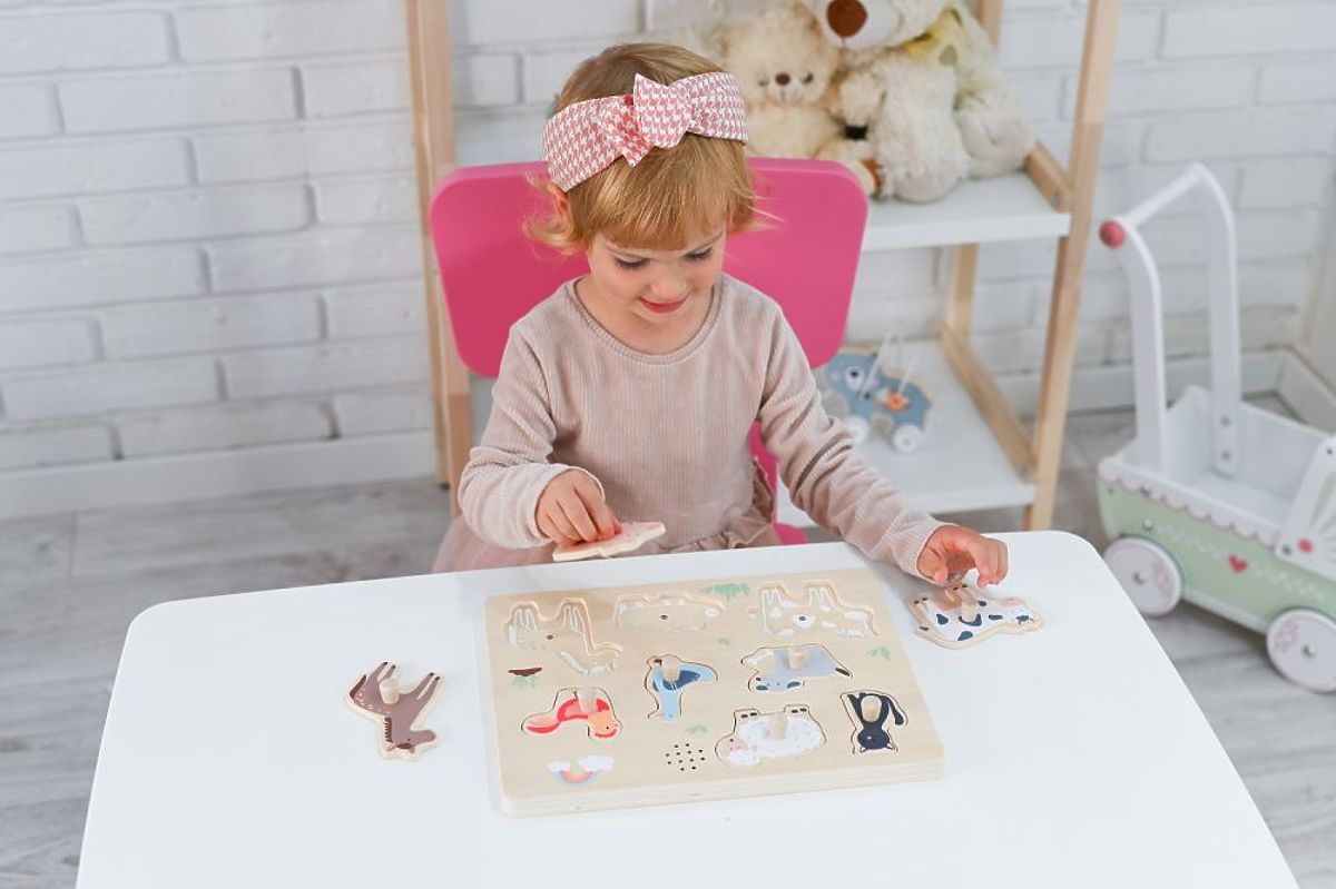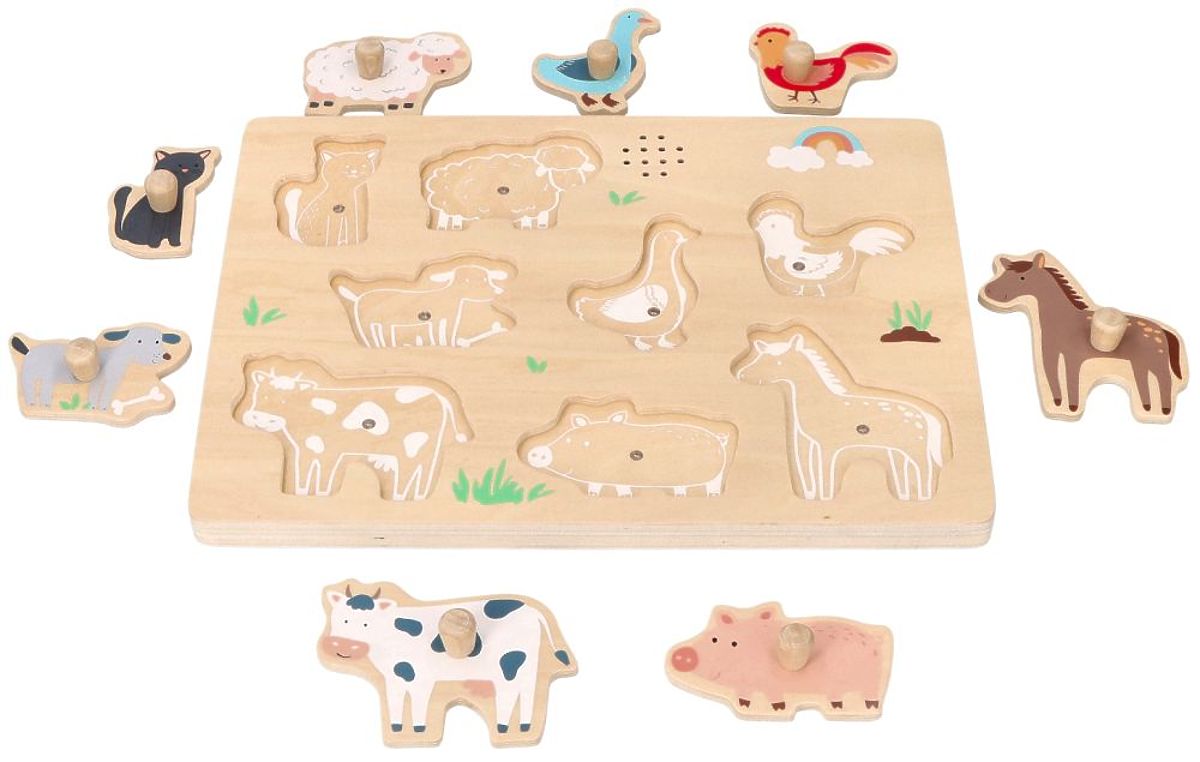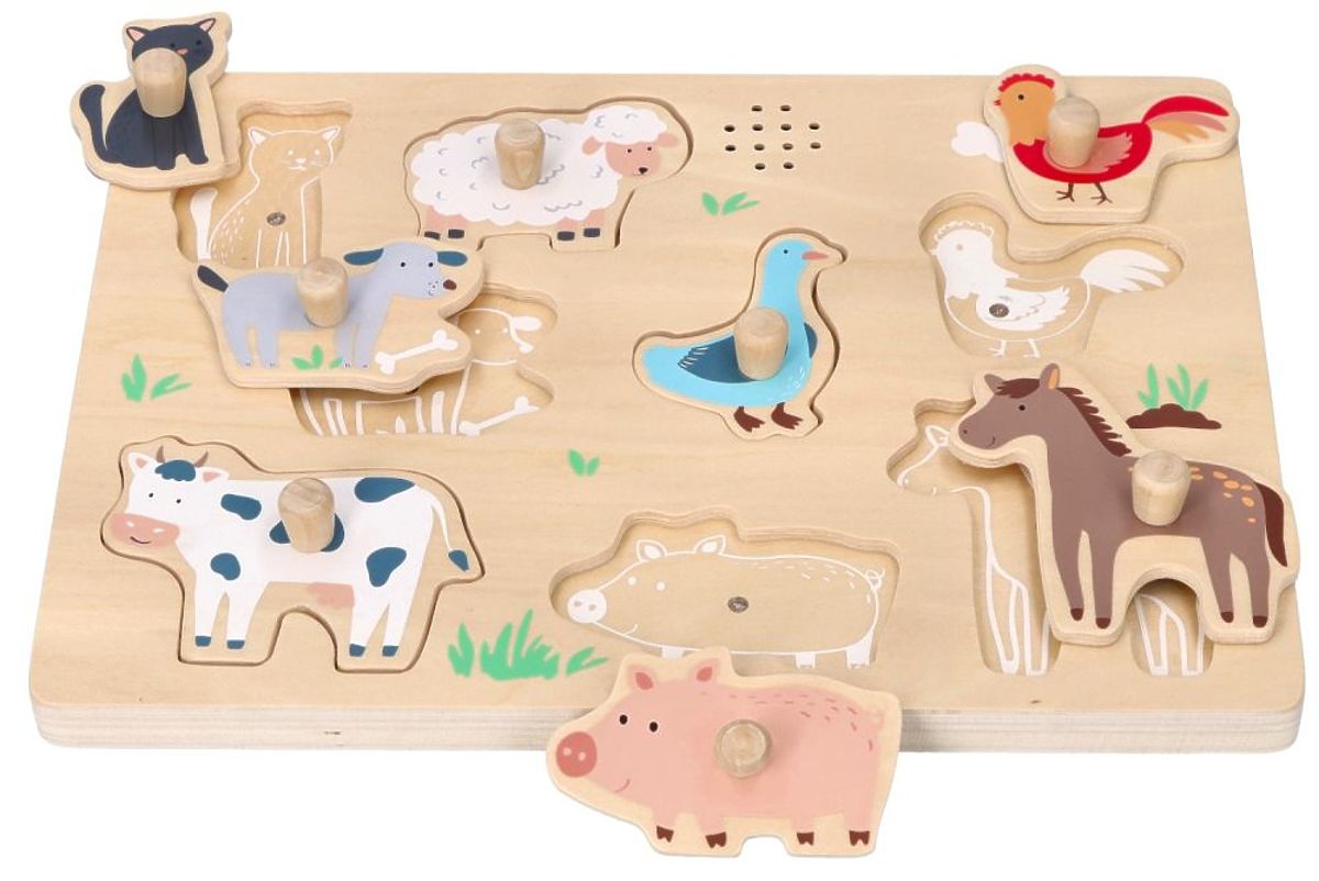 Zvuková nabídka od značky Adam Toys. Dítě se seznamuje se zvířaty z farmy a zároveň přizpůsobuje jejich tvary na správné místo v puzzle. Pokud správně umístí zvířátka na své místo, uslyší realistický zvuk, který vydává přizpůsobované zvíře. Pes štěká, kočka mňouká, koník řehtá atd. Puzzle je vyrobeno z přírodního dřeva, skládá se ze základny a 8 zvířátek z farmy. Najdete zde: psa, kočku, koníka, prasátko, krávu, ovci, kachnu a slepici. Hračka skvěle rozvíjí představivost našeho dítěte, učí koncentraci a pozorovacím schopnostem. Dítě také cvičí manuální dovednosti, zejména prsty, a zvuk ho navíc povzbuzuje ke hře.
