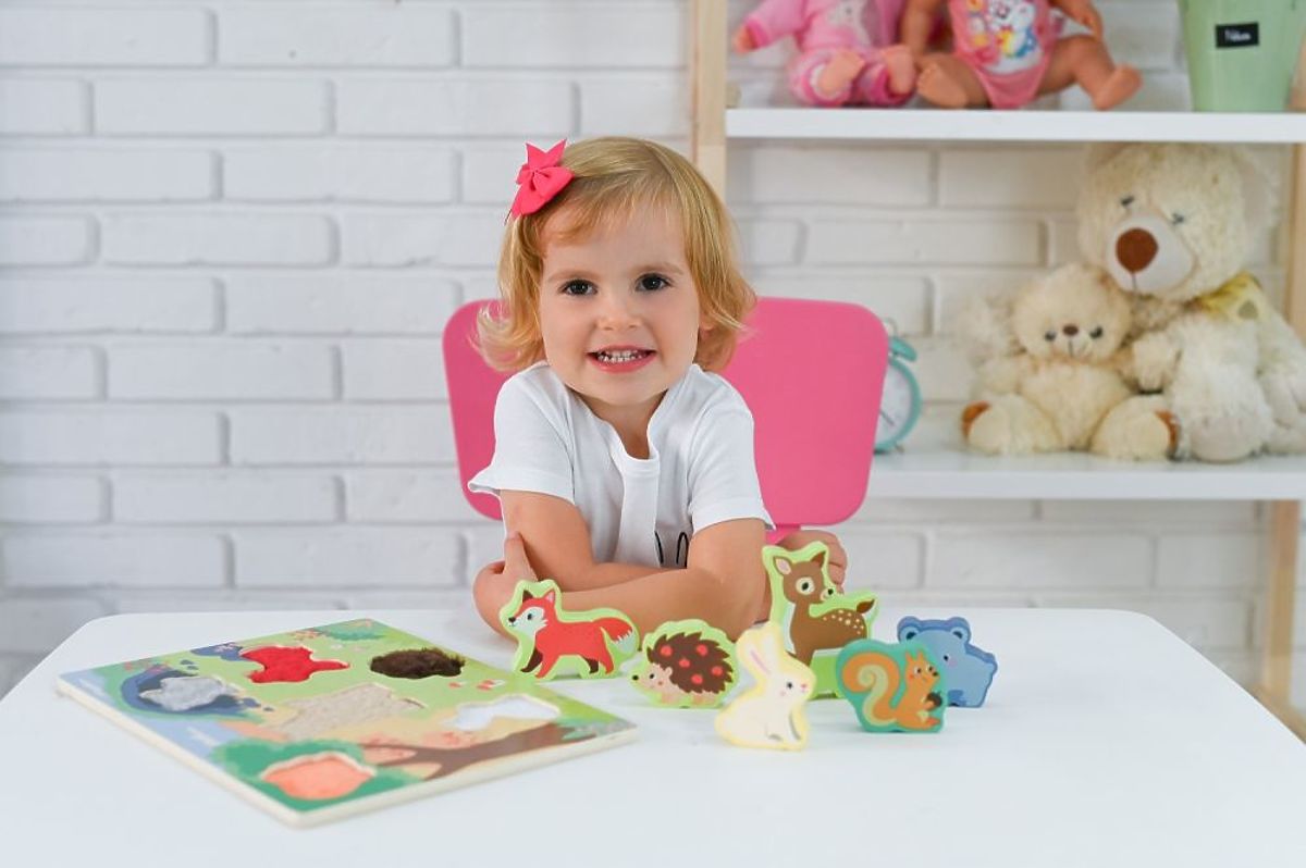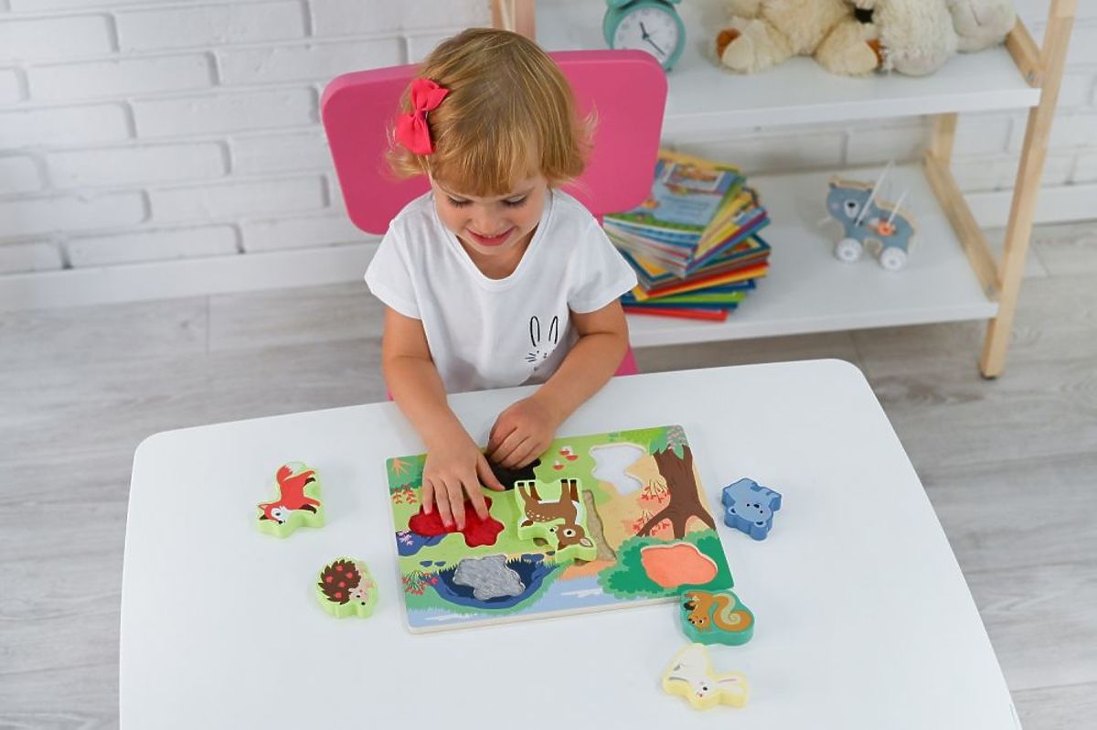 Veselá multifunkční skládačka Lesní zvířata. Dítě si při hře se skládačkou přizpůsobuje prvky do prázdných míst a zároveň poznává lesní zvířata. Najdete zde zajíce, ježka, lišku, veverku, medvěda a srnku.