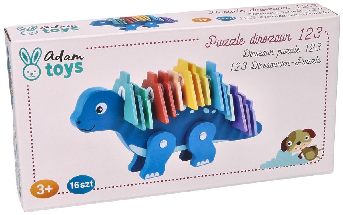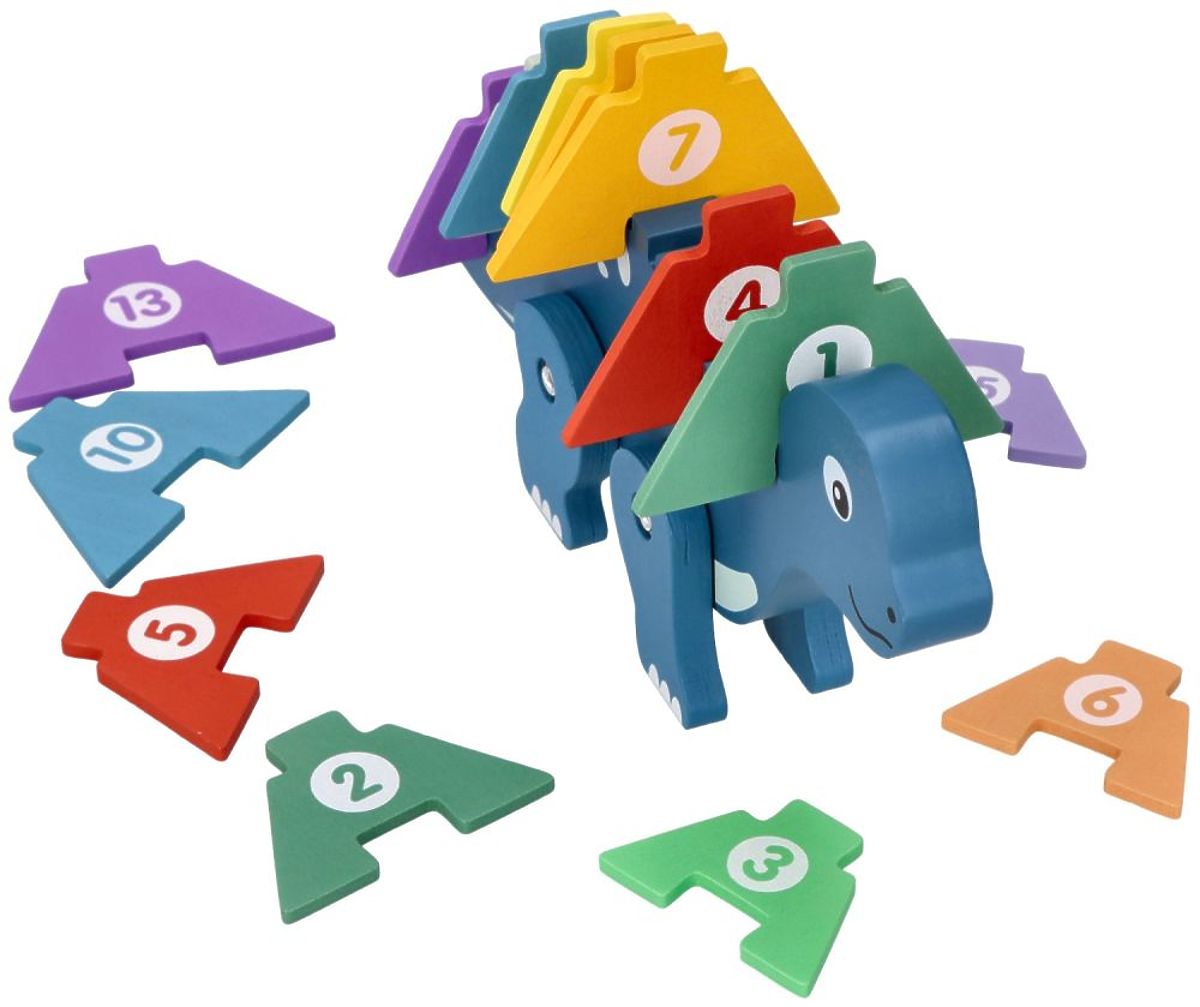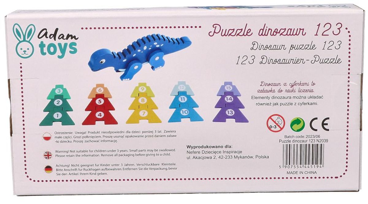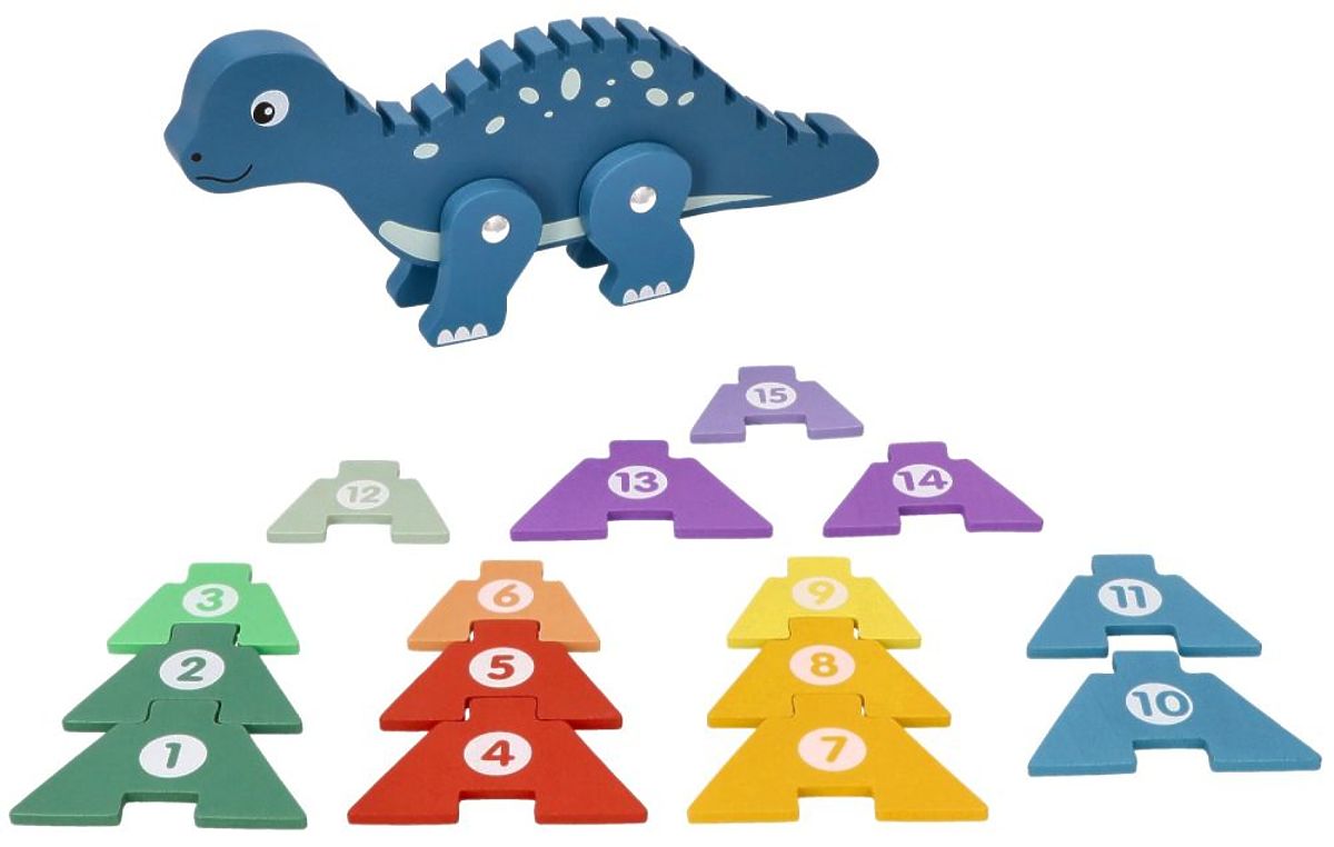 Dřevěný dinosaurus s kompletem číslic od 1 do 15. Pomocný při učení počítání. Barevné puzzle lze skládat na hřbetě dinosaura, což usnadňuje jejich ukládání. Rozměry balení: 25 x 13,5 x 5 cm Věk: 3+ Reference: N2039 Prohlášení o shodě CE