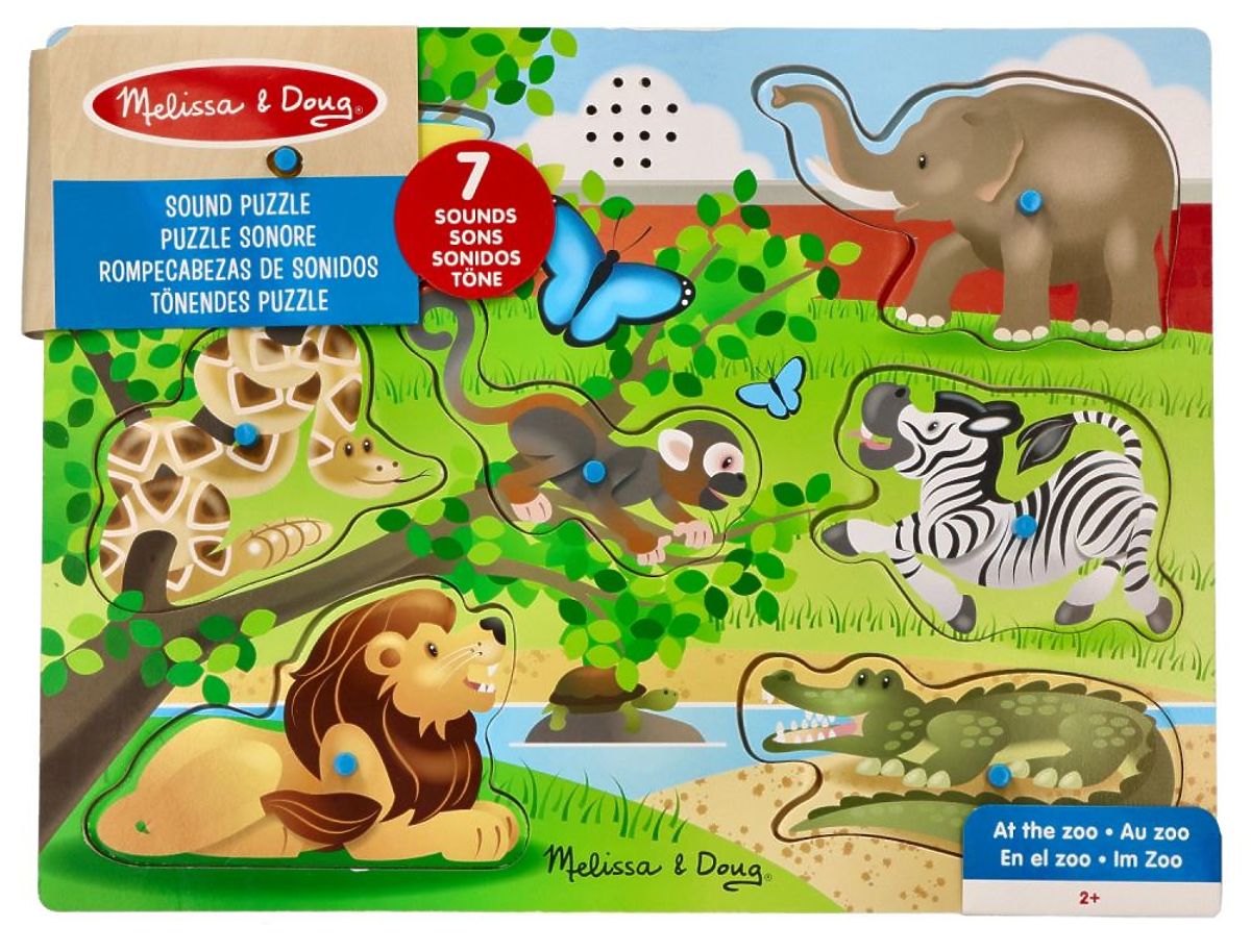 Malý hráč při hraní se skládačkou přizpůsobuje dílky prázdným místům, a po vložení zvířátka na své místo uslyší zvuk. Zvuk je odrazem zvuku vydávaného daným zvířetem. Skládačka je vyrobena z přírodního dřeva, skládá se ze základny a 7 puzzle dílků - zvířátek ze Zoo. Najdete zde: krokodýla, lva, hada, opičku, slona, zebru a papouška. Pod každým tvarem se nachází přesně stejný obrázek jako na dílku.