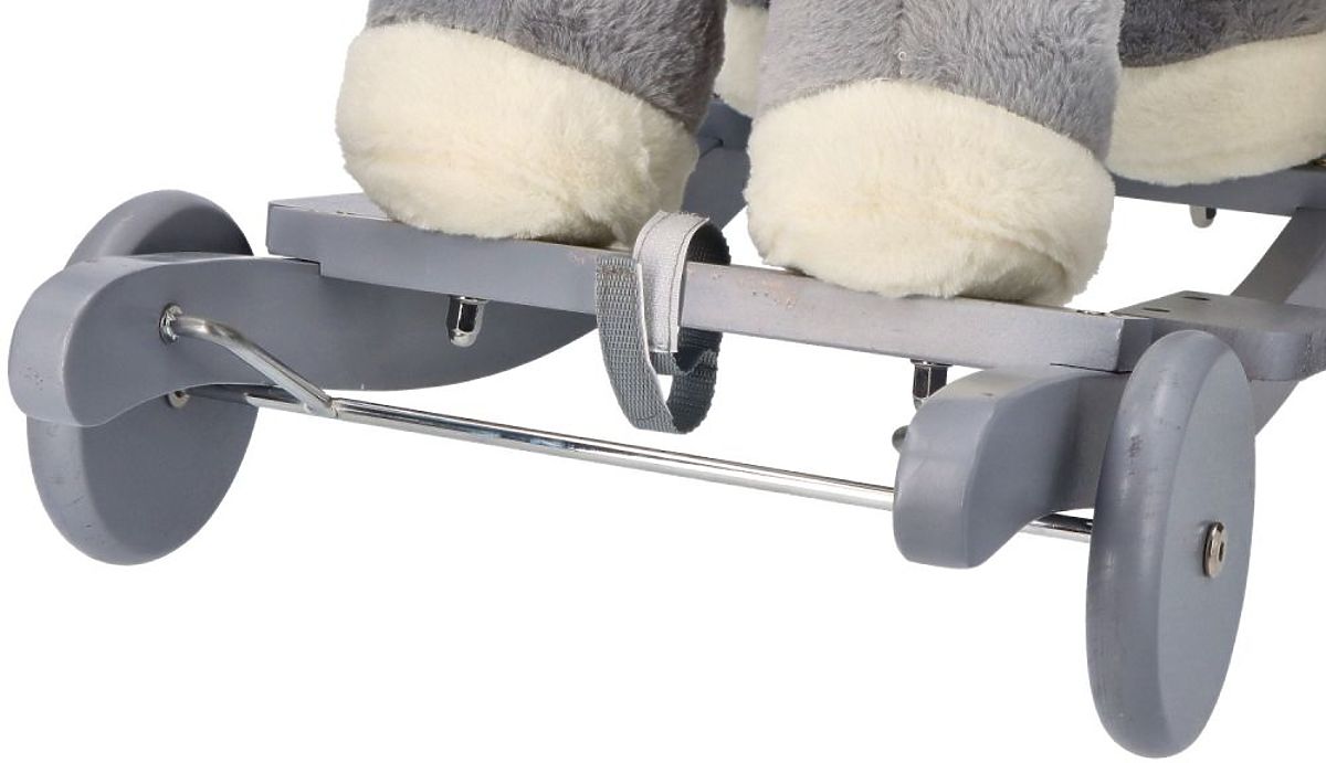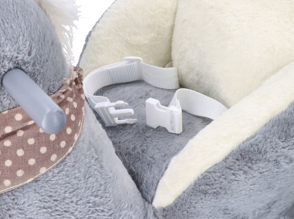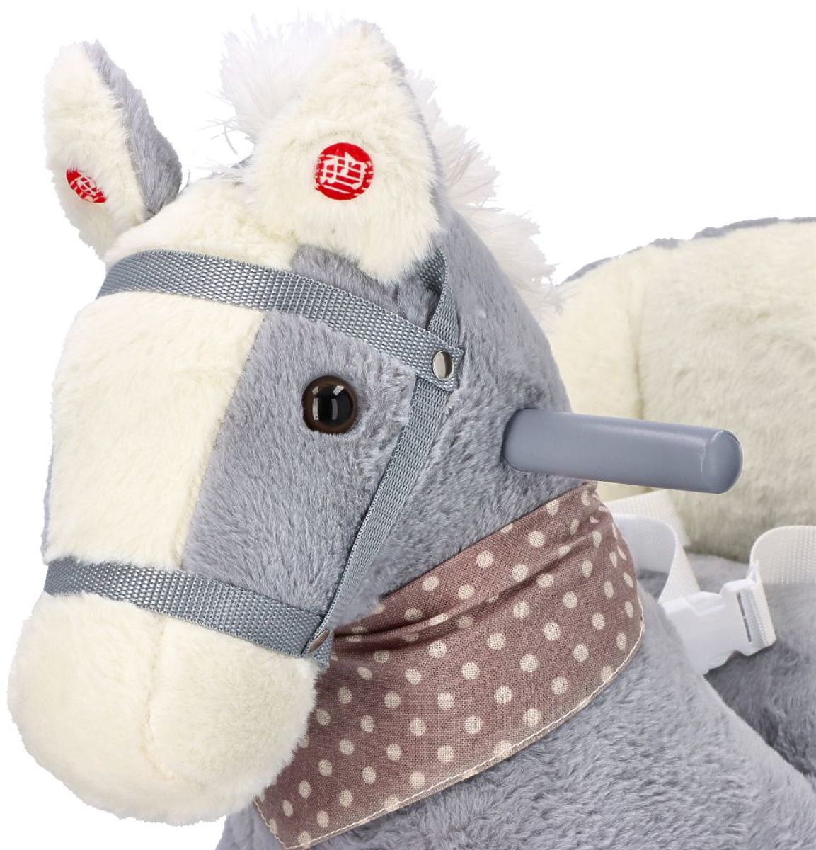Koník je vyroben z měkkého a příjemného na dotek plyšového materiálu v jemné šedé barvě. Ližiny a držadla jsou vyrobeny ze dřeva v šedém odstínu, který se dokonale hodí k celku. Bílá kopýtka, bílé vnitřní části křesílka a šátek na krku s roztomilými puntíky činí koníka neodolatelným.