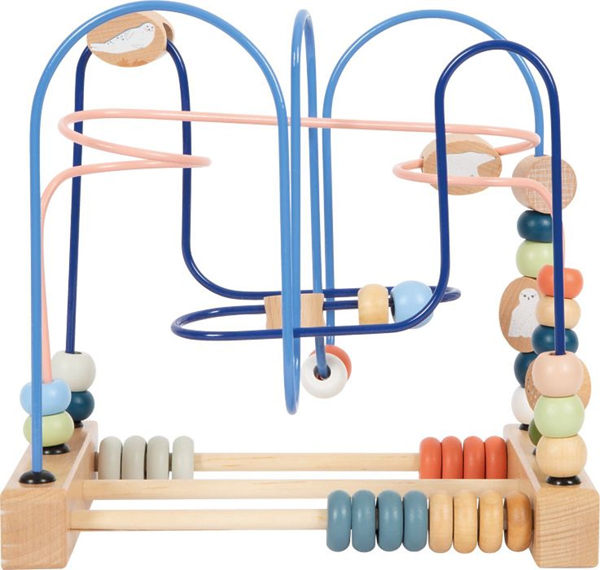 Na třech kovových barevných tyčích (tmavě modré, růžové a modré) jsou dřevěné korálky, které dítě může libovolně posouvat, čímž cvičí přesnost pohybů prstů a rukou. Na smyčkách jsou navíc 3 kostky s obrázky arktických zvířat: sněžné sovy, bílého ledního medvěda a bílého tuleně. U základny proplétanky jsou 2 kolejnice s barevnými posuvnými korálky pro učení počítání.
