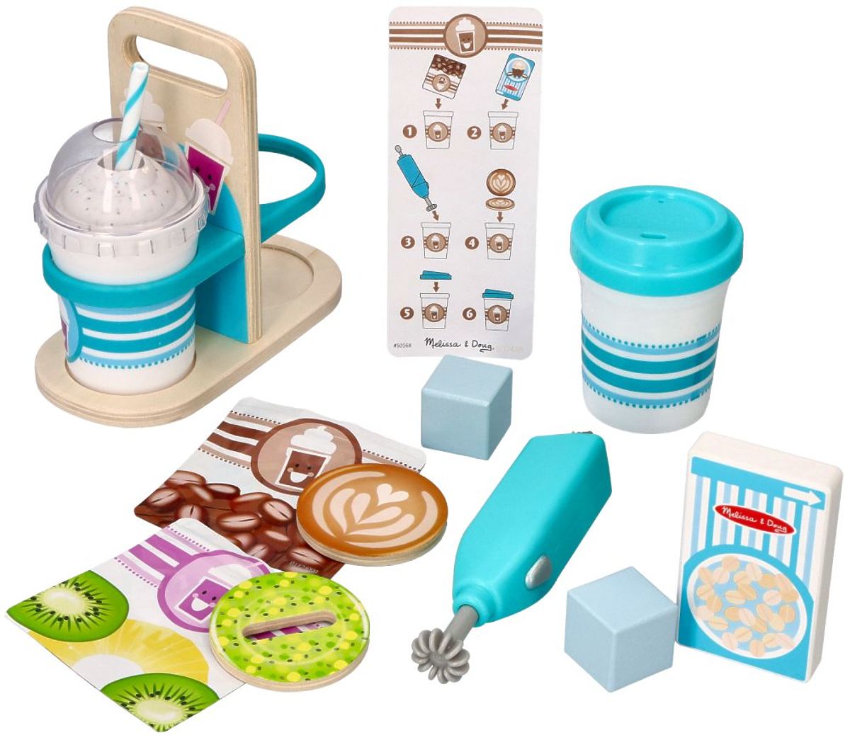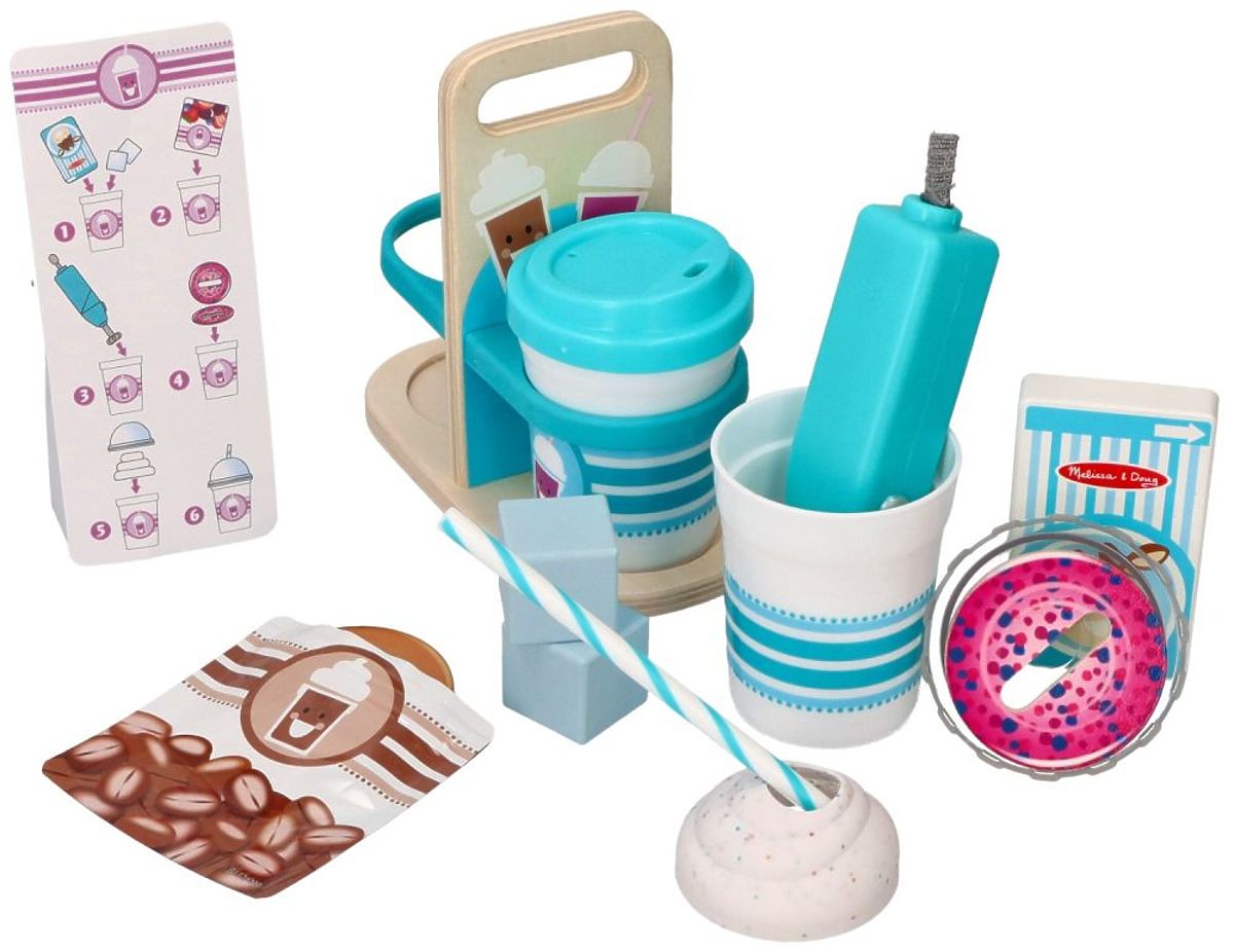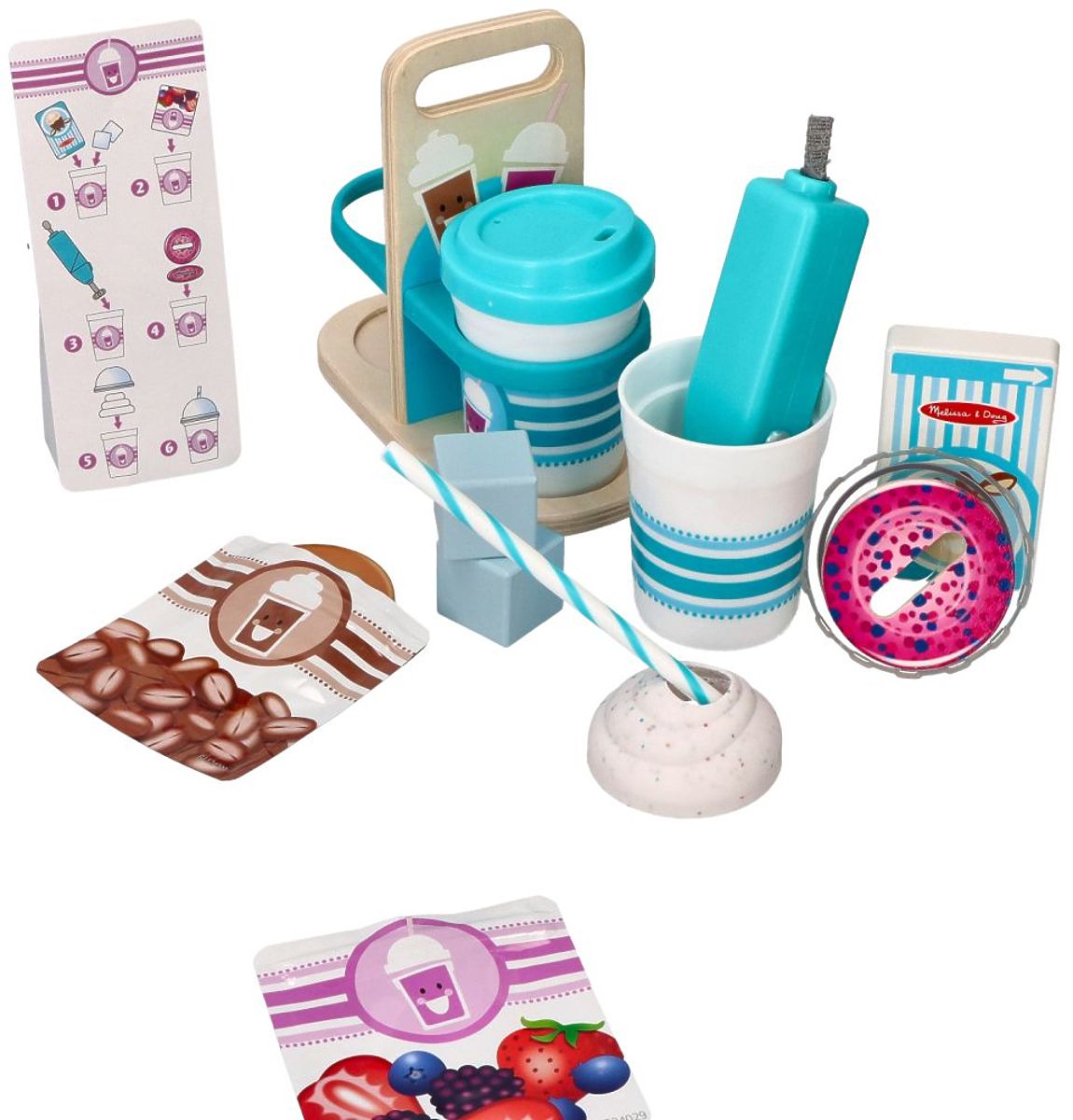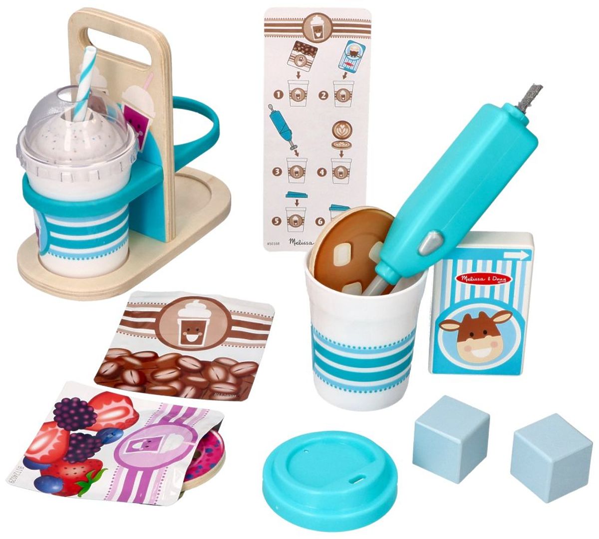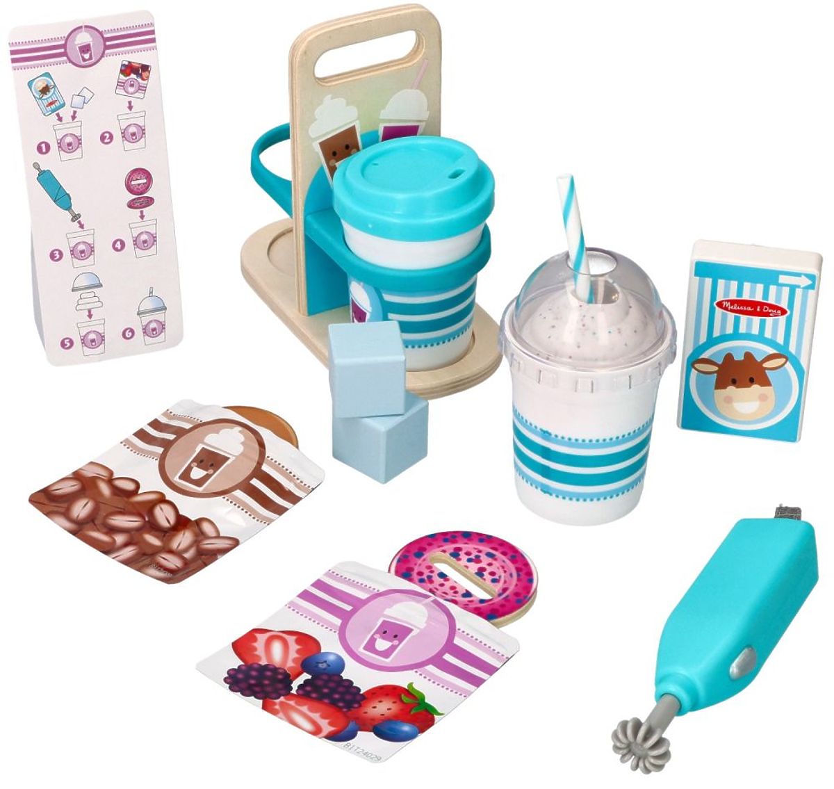 Připravte si lahodné smoothie (borůvkové nebo zeleninové), smíchejte nápoj pomocí vibračního pěniče, přidejte dřevěné kostky ledu a nakonec nasaďte víčko a přidejte slámku. Zahřejte se pitím horkého kakaa nebo kávy s víčkem na horký nápoj na cestu. Nápoje lze přenášet v dřevěném obalu, díky čemuž je hra na role tak realistická.