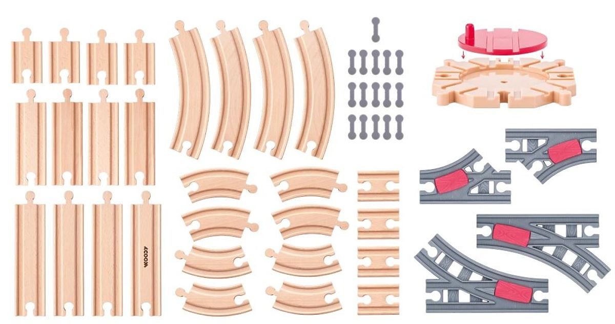 Je vaše oblíbená sada kolejnic příliš krátká? Nebo vám chybí několik zajímavých prvků k doplnění kolejnice? Díky této sadě kolejnic budete mít mnoho dalších možností, jak si postavit svou vlastní a unikátní trasu. Předností této sady jsou zajímavé prvky pro spojování kolejnic: výhybky, točna, adaptéry atd. Někdy se stane, že nelze spojit prvky, protože na obou stranách jsou otvory a chybí spojka. Zde pomohou plastové adaptéry, které snadno spojí kolejnice.