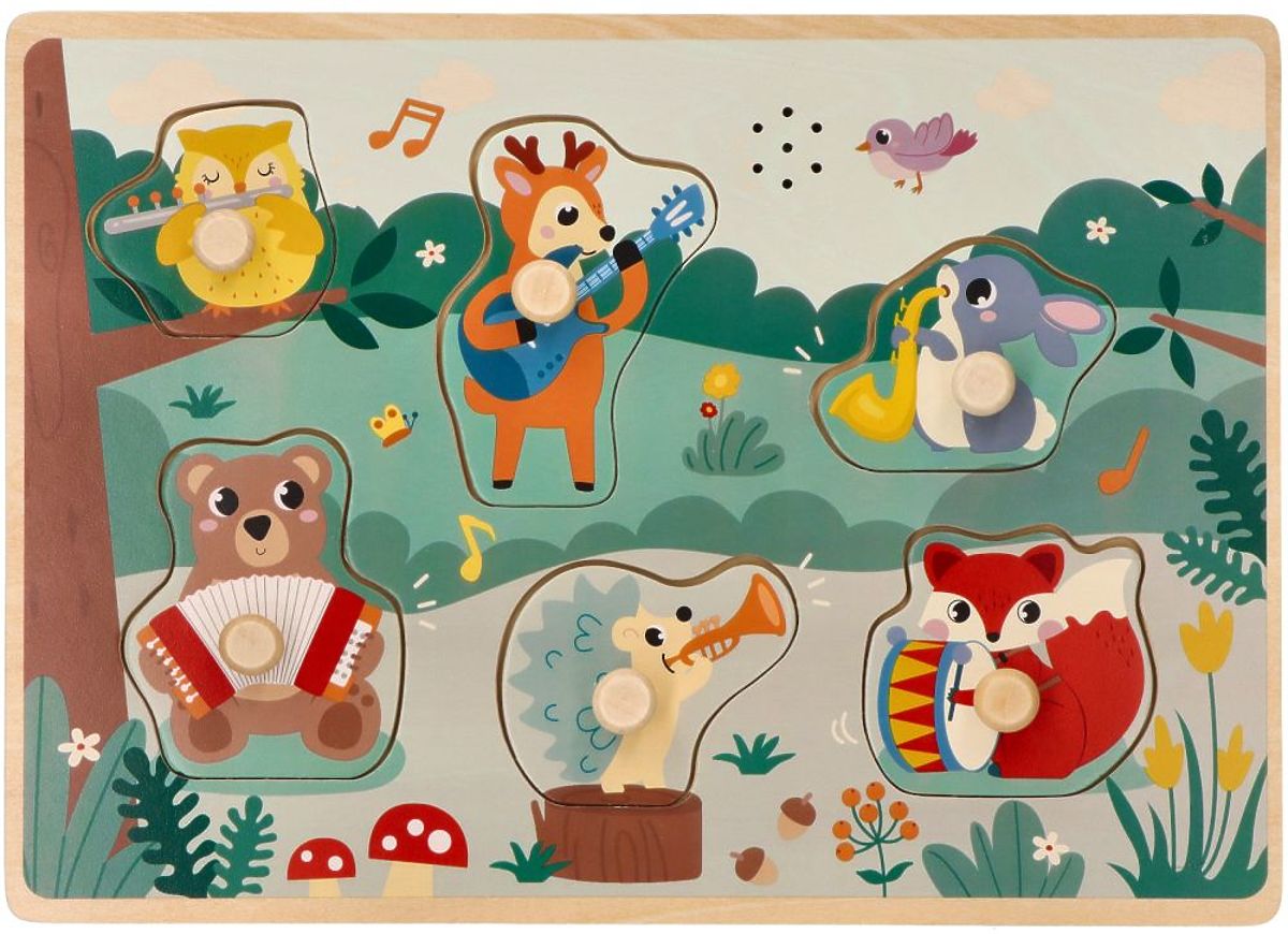 Další zvuková nabídka od Adam Toys vedle skládačky farma a safari. Tentokrát se seznámíme nejen se zvířaty z lesa, ale také se zvuky různých nástrojů. Úkolem je samozřejmě přizpůsobit tvar zvířátka správnému místu na skládačce. Pokud to udělá správně, uslyší jako odměnu zvuk nástroje, na který hraje každé ze zvířátek. Tato vzdělávací hračka skvěle rozvíjí dětskou představivost, učí koncentraci a pozorovací schopnosti. Dítě si také procvičuje manuální dovednosti, zejména prstíky, a zvuk ho navíc povzbuzuje ke hře.