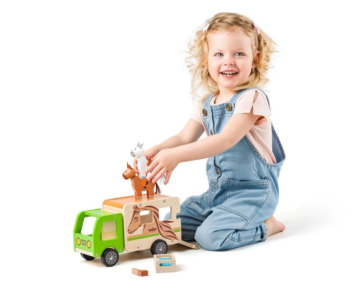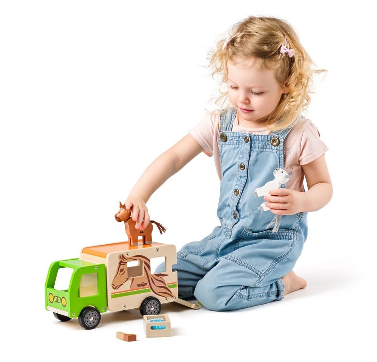 Je vaše dítě fanouškem všech zvířátek, zejména koní? Pokud navíc miluje vozidla, je tato hračka pro něj přímo stvořená. Nákladní vůz pro přepravu koní je bezpečná hračka pro malé děti, která zajišťuje mnoho hodin fantastické zábavy. Zadní část nákladního vozu lze rozložit, aby vznikla rampa umožňující snadné vyvedení koní, a boční dveře poskytují přístup pečovatelům. Sada obsahuje dvě dřevěné figurky koní s nezbytnými doplňky a dva pečovatele s pohyblivými končetinami.
