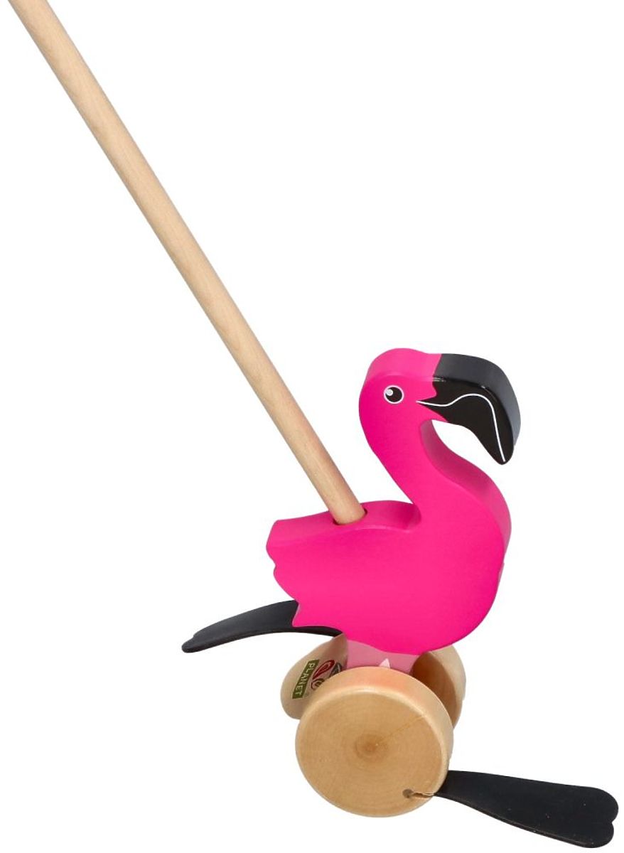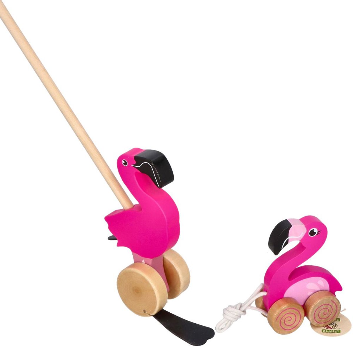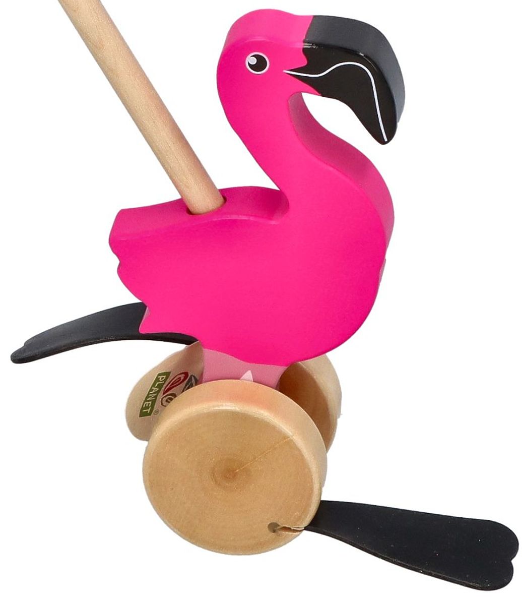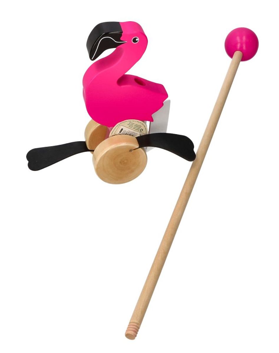 Představujeme ideálního společníka na společné procházky. Okouzlující růžový Plameňák ze dřeva je hračka, která bude povzbuzovat dítě k pohybu a chůzi. Dítě uchopí tyč a tlačí ptáčka před sebou. Kola při otáčení způsobují plácání gumových prvků o zem. Tyč je zakončena rukojetí, aby bylo pohodlné tlačit hračku. Tyč je přišroubovaná.