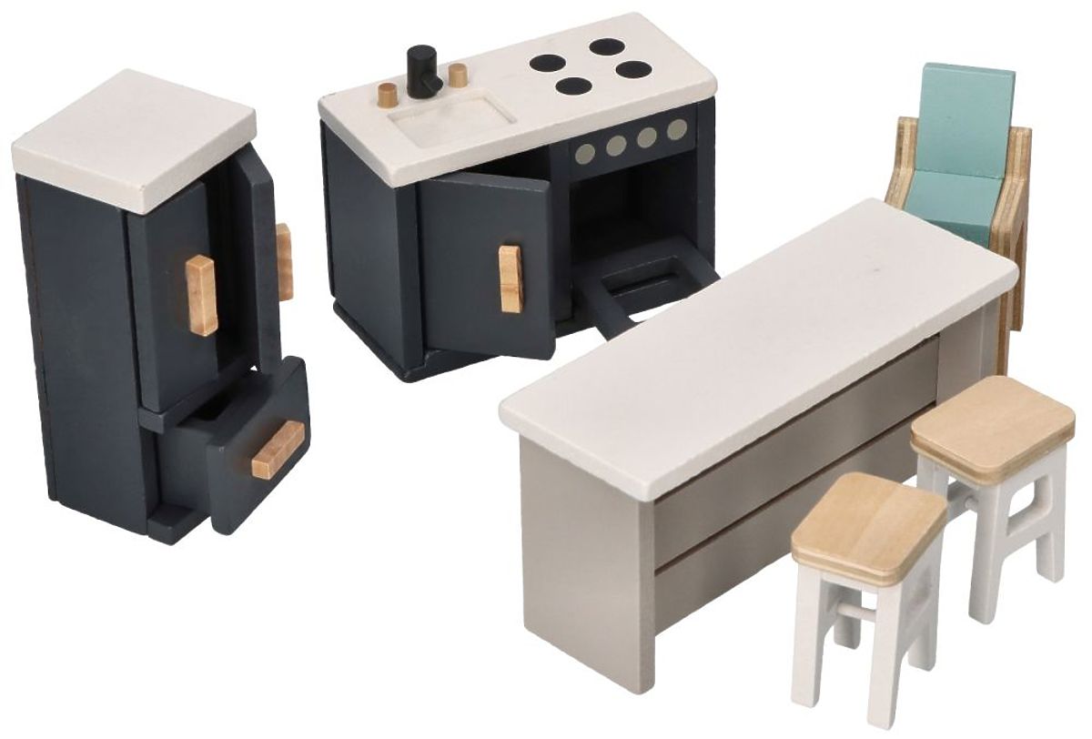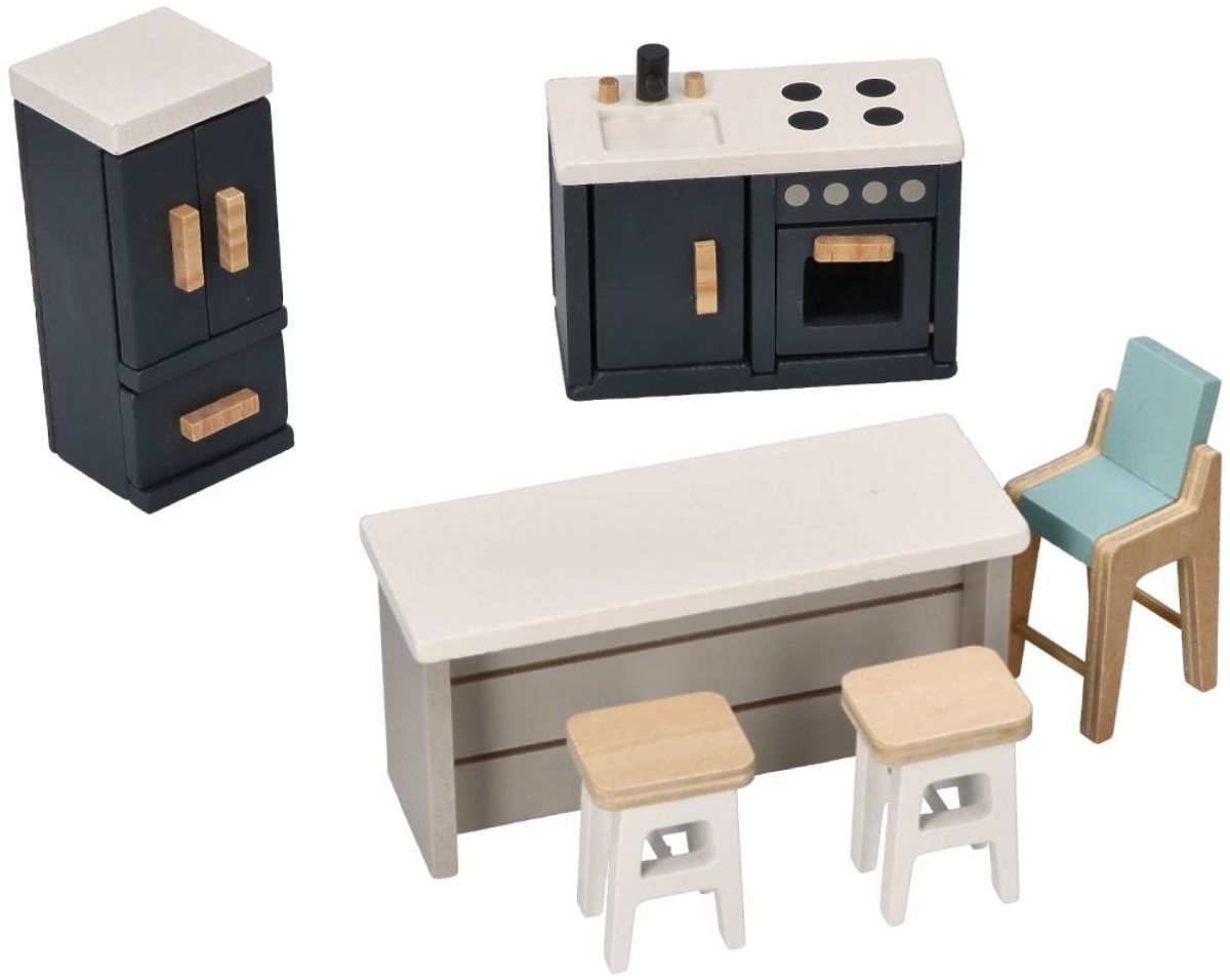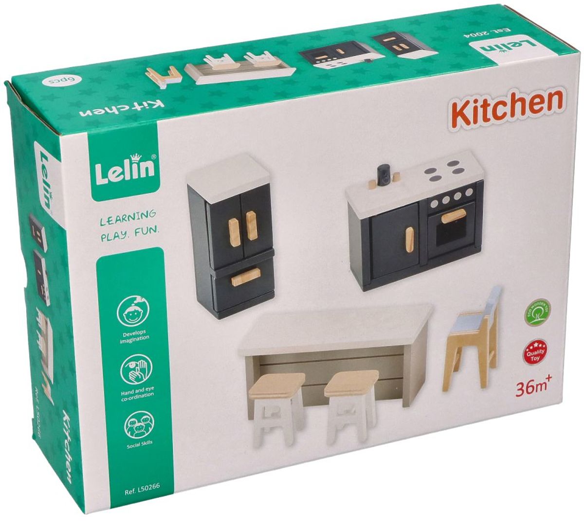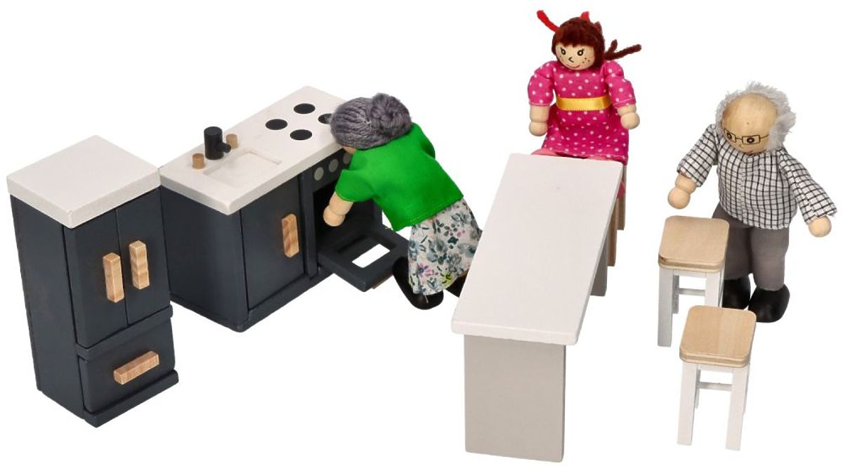 Stylová kuchyňská sada ze dřeva je dokonalým doplňkem domečku pro panenky. Každý prvek byl vyroben s precizností a péčí o detaily – od malých úchytů po otevírací dvířka ve skříňkách. Nábytek je lehký, odolný a zcela bezpečný pro děti – má hladké, pečlivě obroušené povrchy.