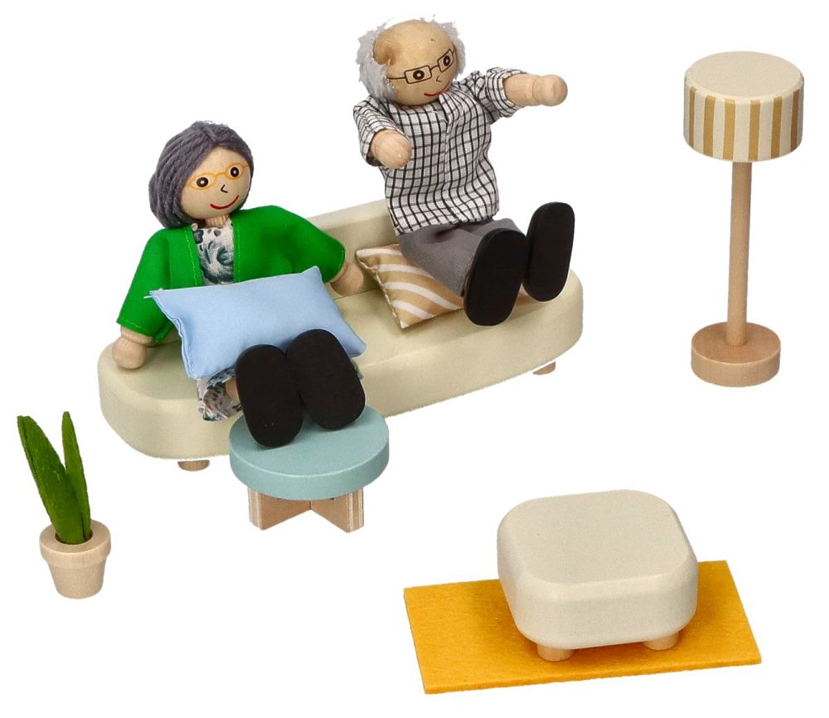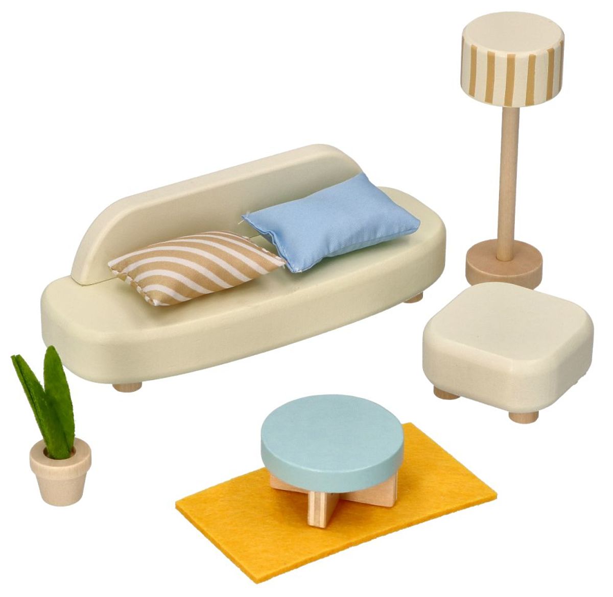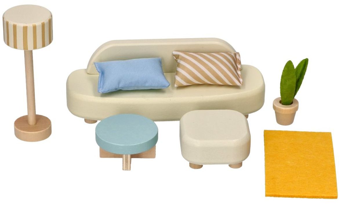 Útulná sada nábytku do obývacího pokoje vyrobená ze dřeva je ideálním doplňkem do domečku pro panenky. Součástí sady je elegantní pohovka s taburetem, malý konferenční stolek, stojací lampa a měkký kobereček – vše, co potřebujete k vytvoření atmosférického, domácího interiéru.