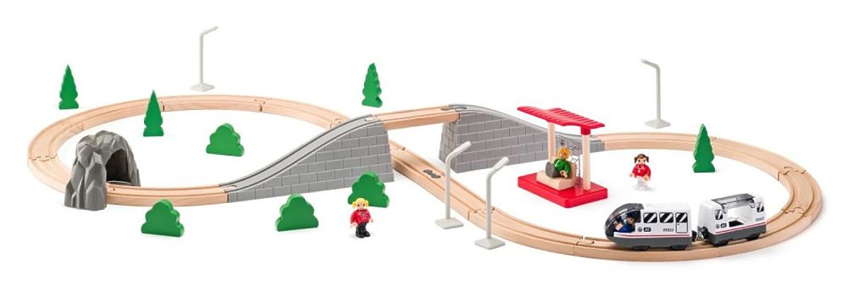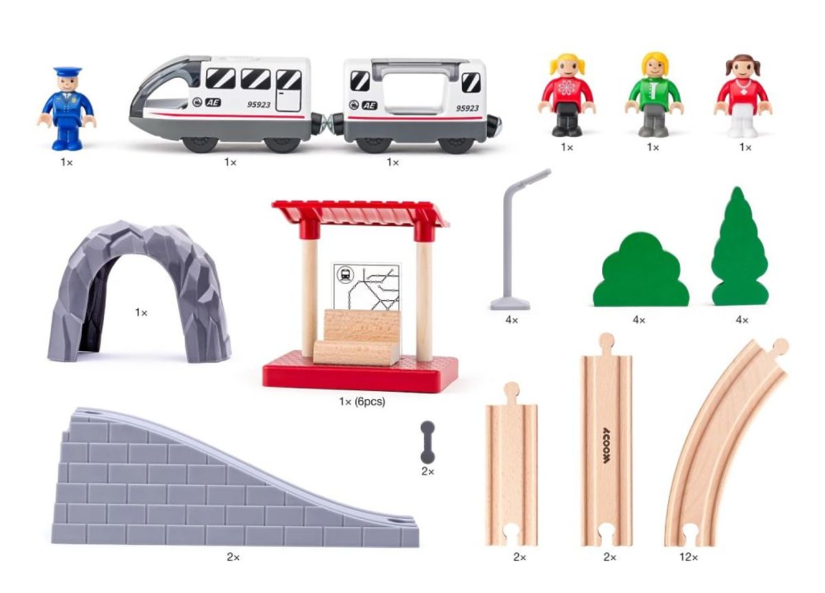 Sada obsahuje vše, co potřebujete k zahájení cesty: pevné dřevěné koleje, most, plastový tunel, železniční zastávku a elektrický vlak s osobní kabinou. Celkový dojem doplňují detailní prvky scenérie — stromy, keře, lampy a figurky s pohyblivými končetinami, které oživí každé železniční dobrodružství.