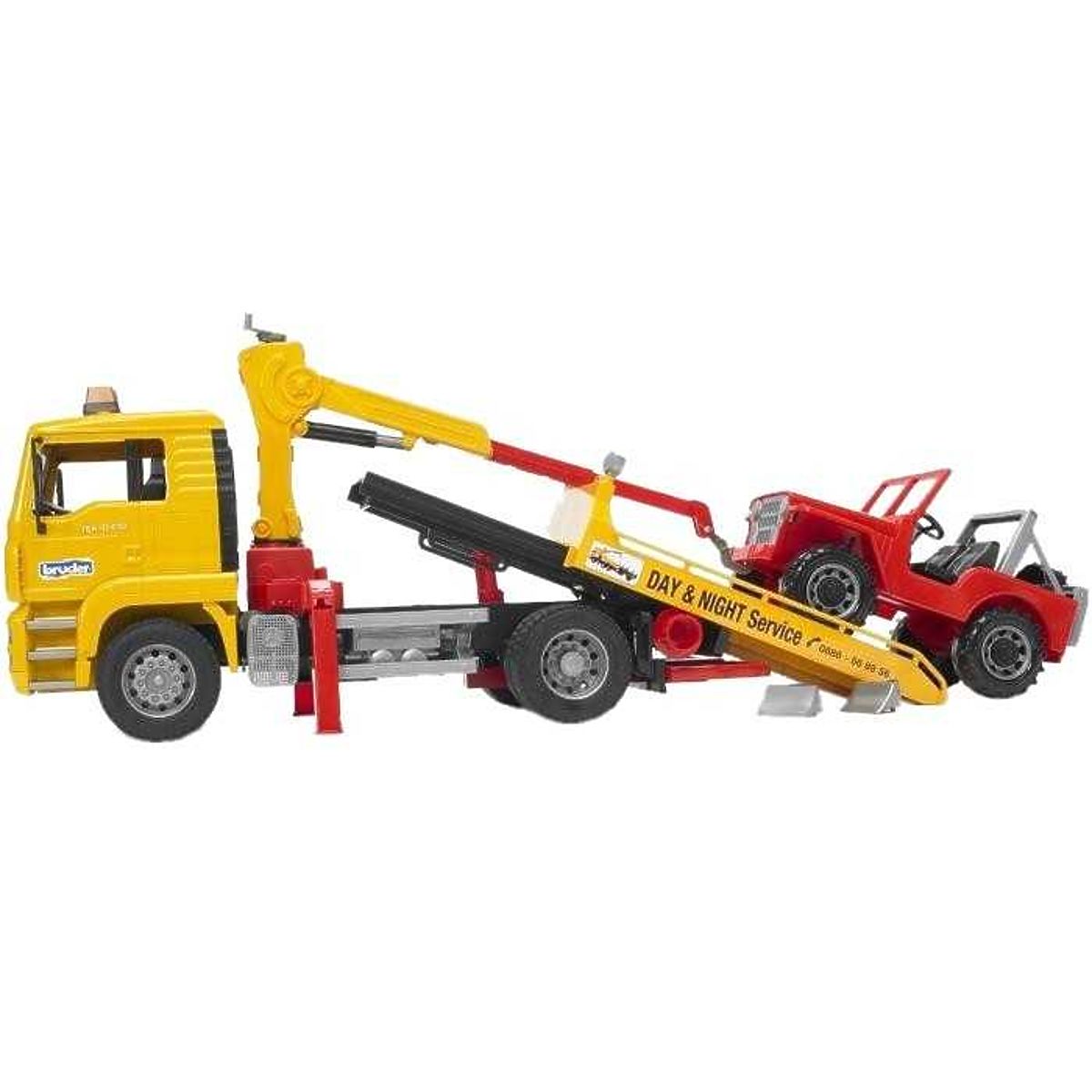 Bruder Nákladní auto MAN odtah + JeepOdtahová služba + Jeep je odtahový vůz včetně jeepu. Odtahový vůz MAN TGA má sklápěcí kabinu, je možné nahlédnout na blok motoru a přední sklo vyrobené z vysoce odolného nerozbitného polykarbonátu. Za kabinou je umístěna funčkní otočná manipulační ruka, která se nechá vysunout a její součástí jsou řetězy s úchytnými segmenty pro snadnou manipulaci s jeepem. Nástavba má podkladové klíny a výklopné opěry pro 100% stabilitu plně naloženého odtahového vozu. Terénní Jeep má otvíratelnou kapotu motoru, přední čelo se dá sklopit a má velmi jednoduché osové řízení. Na odtahový vůz lze dokoupit a instalovat světelný a zvukový maják (BR2801) a též přední radlici (BR2775). Vyrobeno v Německu, z kvalitních materiálů. Hlavní vlastnosti: nákladní auto s Jeepemsklápěcí kabinaotevíratelná kapota motorusklopné přední čelootočná manipulační rukavyrobeno v Německu