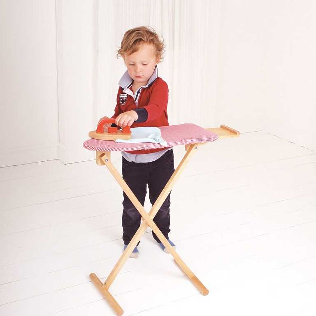 Vaši nejmenší budou jistě nadšení z tohoto jasného a robustního dřevěného žehlícího prkna a dřevěné žehličky. Ideální k žehlení oblečení pro panenky, nebo k pomáhání žehlení mamince či tatínkovi. Skvělý doplněk k našemu dřevěnému sortimentu pro domácnost. Vyrobeno z vysoce kvalitních, zodpovědně získaných materiálů. Splňuje aktuální evropské bezpečnostní normy. Hlavní vlastnosti: obsahuje dřevěné žehlící prkno potažené látkou a dřevěnou žehličkoupodporuje kreativitu, zručnost a realistickou hru