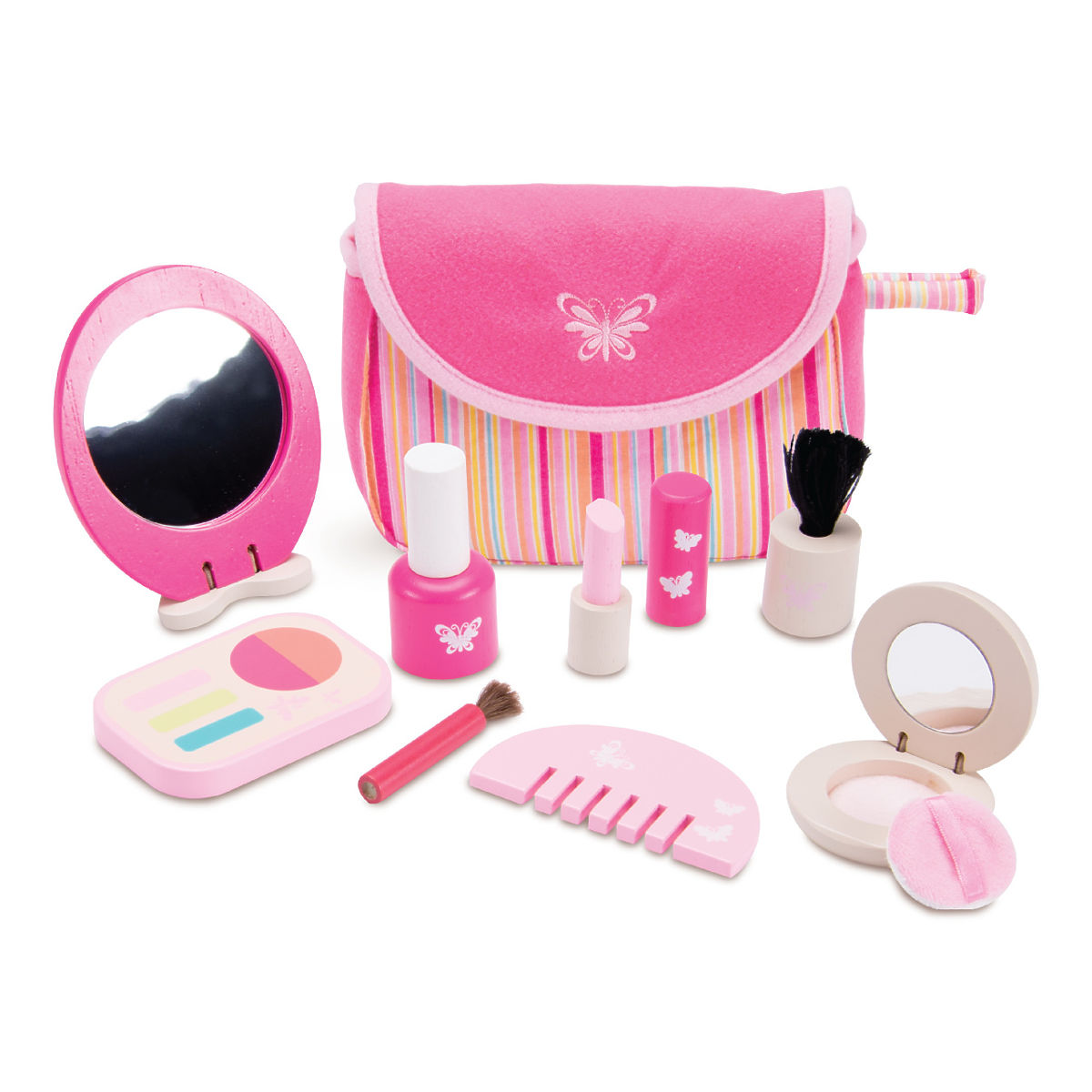 Tato růžová souprava se šminkami nadchne každé dítko, které se rádo parádí. Líčit a napodobovat své oblíbené idoly je s touto kompaktní, ale bohatou sadou doslova hračka. Děti si mohou zábavnou formou osvojit společenské způsoby a dovednosti. Všechna líčidla jsou uložena v originální, roztomile pruhované taštičce zdobené ikonou motýlka. Součásti jsou vyrobeny z odolného masivního dřeva a umožňují snadnou manipulaci malýma dětskýma ručkama. Hlavní vlastnosti:taštička, zrcátko, hřeben, pudřenka, paletka, rtěnka, lak na nehty a 2 štětečkypraktické a kompaktní baleníodolné dřevěné provedení