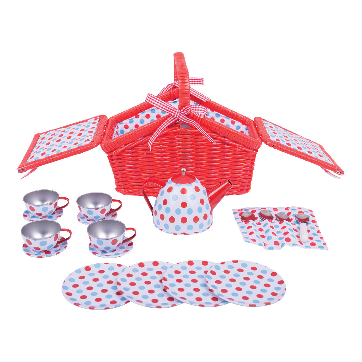 Babynabytek.cz » Kuchyňky / Vybavení do kuchyňky / Bigjigs Toys Čajová puntíkovaná sada v piknikovém koši