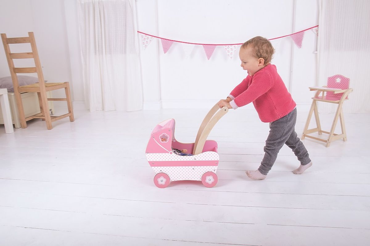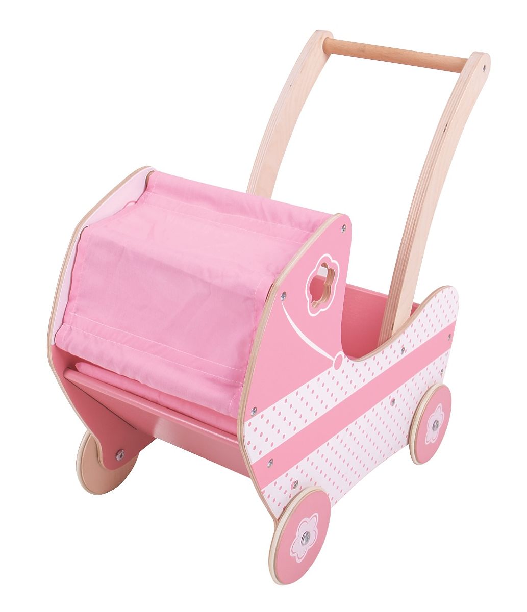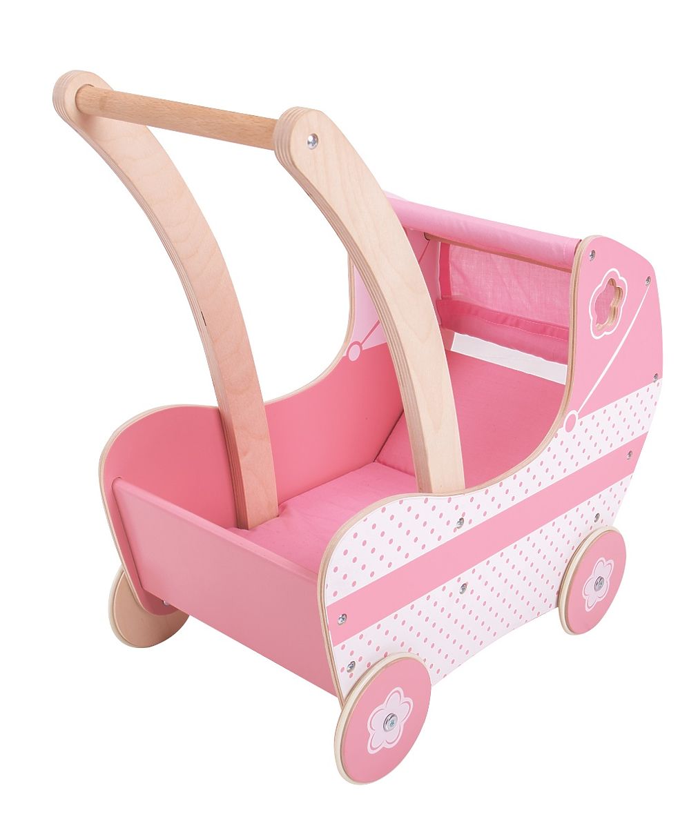 Dřevěný kočárek pro panenky v krásné růžové barvě s látkovou stříškou a precizně vyřezávanými detaily. Kočárek obsahuje jednoduchou vystélku, aby panenky cestovaly pohodlně. Pevná kola jsou opatřena gumovým proužkem pro tichý chod i na tvrdých podlahách. Pohodlně uchopitelné madlo a stabilní konstrukce zaručují zábavu při hře. Pomáhá inspirovat kreativní hraní rolí a rozvíjí sociální dovednosti. Vyžaduje montáž. Vyrobeno z vysoce kvalitních, zodpovědně získaných materiálů. Splňuje aktuální evropské bezpečnostní normy. Lze jej využít i jako dekoraci. Hlavní vlastnosti: rozvíjí kreativitu a sociální dovednostipohodlně uchopitelné madlo a stabilní konstrukceobsahuje jednoduchou vnitřní vystélkupogumovaná pevná kola