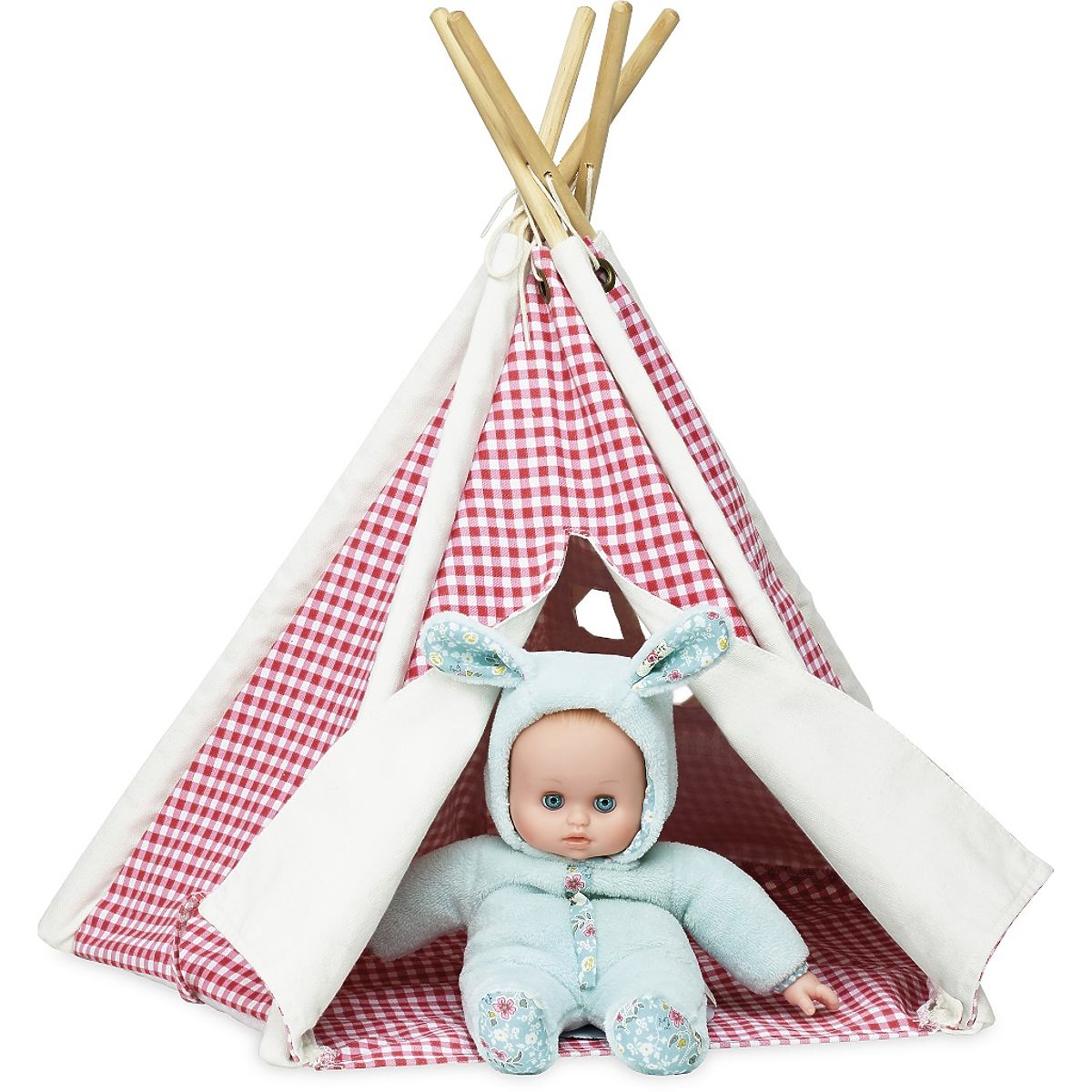 Krásné kárované týpí v mini provedení, ideální pro panenky. Dřevěný základ s textilním přehozem je jednoduché složit. Textil je červeno-bílý. Hlavní vlastnosti: týpí pro panenkypevná konstrukce