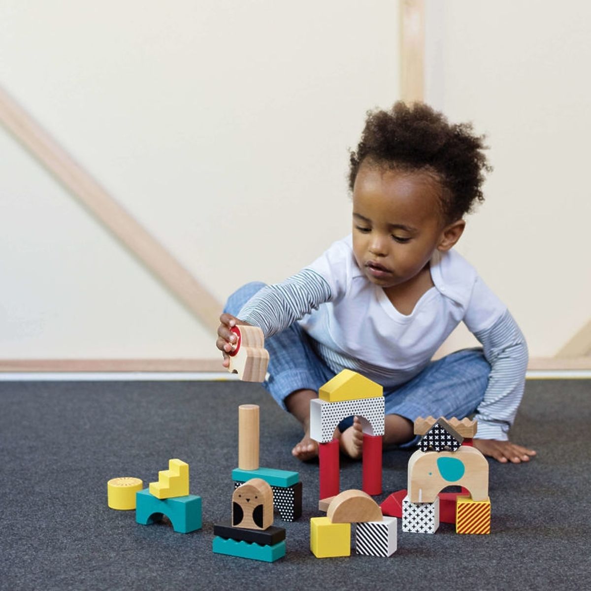 Skládejte, stavte, zbořte, opakujte. Robustní kostky mají jemně zaoblené okraje a jsou jednoduše uchopitelné. Perfektní pro batolata. S 26 dílky v různých tvarech a barvách mohou děti postavit cokoliv, kreativitě se meze nekladou. Obsahuje 14 tvarů a několik vzorů, od teček po proužky a 3 zvířata. Hlavní vlastnosti: Rozvíjí poznávání tvarů, barev a vzorůRozvoj koordinace ruka-okoRozvoj poznávání barev a tvarů i počítání26 kostek v 5 zářivých barváchVyrobeno z kvalitního dřeva z odpovědných zdrojů a netoxických barev na bázi vodySplňuje všechny bezpečnostní normy