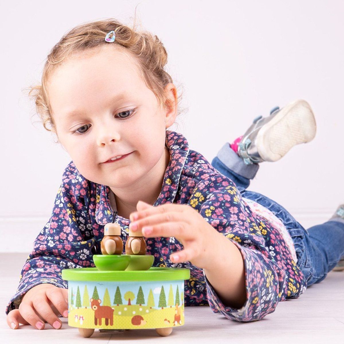 Natočte je a dívejte se, jak pochodují! Tato krásná dřevěná, hudební skříňka má na sobě 2 postavičky, které tančí, kolébají se a otáčejí se v rytmu písně. Děti si tuto hračku jistě zamilují. Postavičky soviček jsou ke skřínce připevněny neviditelnými magnety, ale mohou být jednoduše odděleny a děti si s nimi mohou hrát i jinde. Krásný doplněk do herny nebo dětského pokoje. Podporuje děti v kreativním a představivém hraní. Vyrobeno z kvalitních materiálů z odpovědných zdrojů. Odpovídá evropské bezpečnostní normě. Hlavní vlastnosti: po natažení hraje jemnou melodiipodporuje kreativitu a představivostfigurky se pohybují v rytmu ukolébavkytrénuje jemnou motoriku
