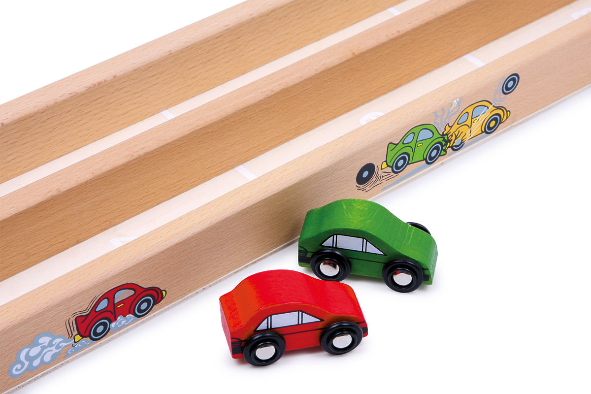 Dlouhá závodní rampa je vybavena odpalováním z gumy. Stačí natáhnout a auto se rozjede a Vy už jen sledujte, kterému autíčku se podařilo vyvinout vyšší rychlost. Po stranách zdobeno barevnými ilustracemi. Hlavní vlastnosti: rampa se dvěma dráhami2 autíčka součástí balení